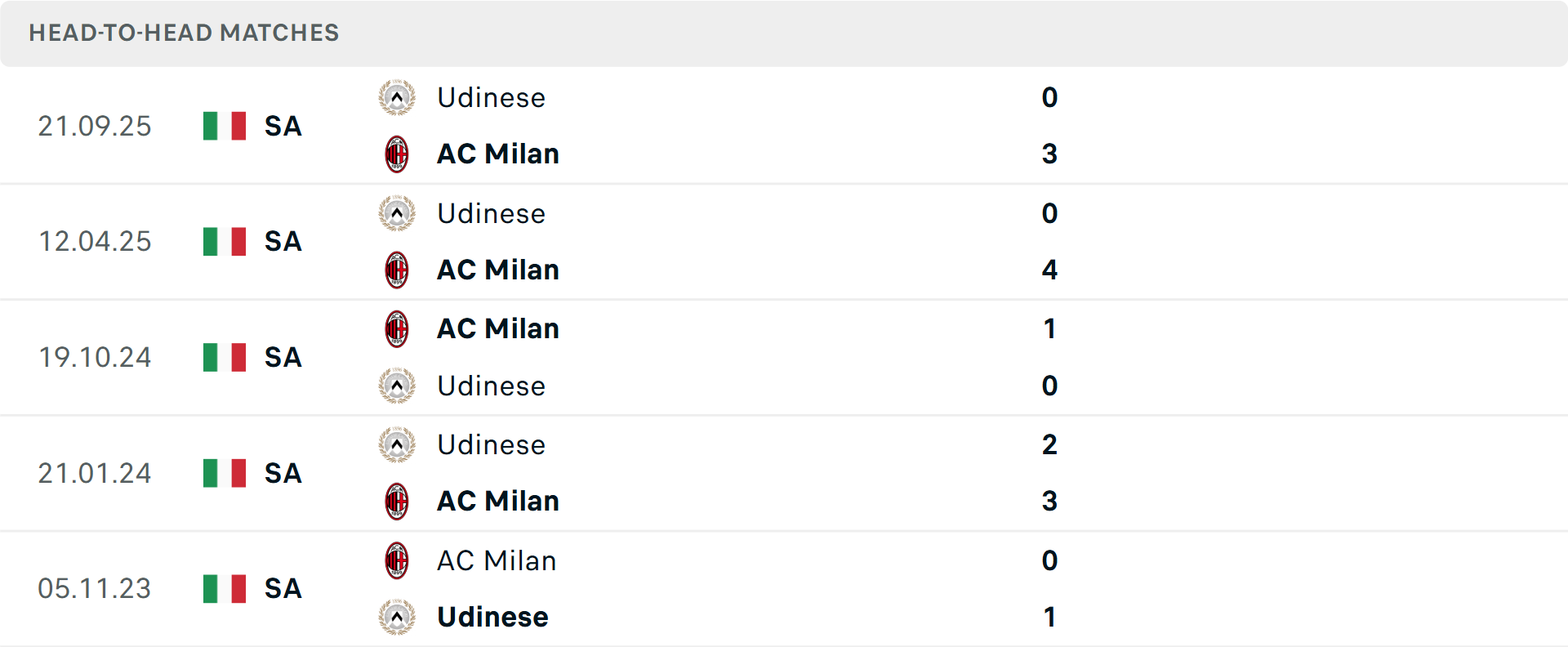 Dù phong độ gần đây khá phập phù với 3 thất bại trong 6 trận, Rossoneri vẫn rất đáng gờm tại San Siro. Lịch sử đối đầu cũng ủng hộ đội chủ nhà khi họ toàn thắng 4 lần chạm trán gần nhất trước Udinese với tổng tỷ số áp đảo 11-2.