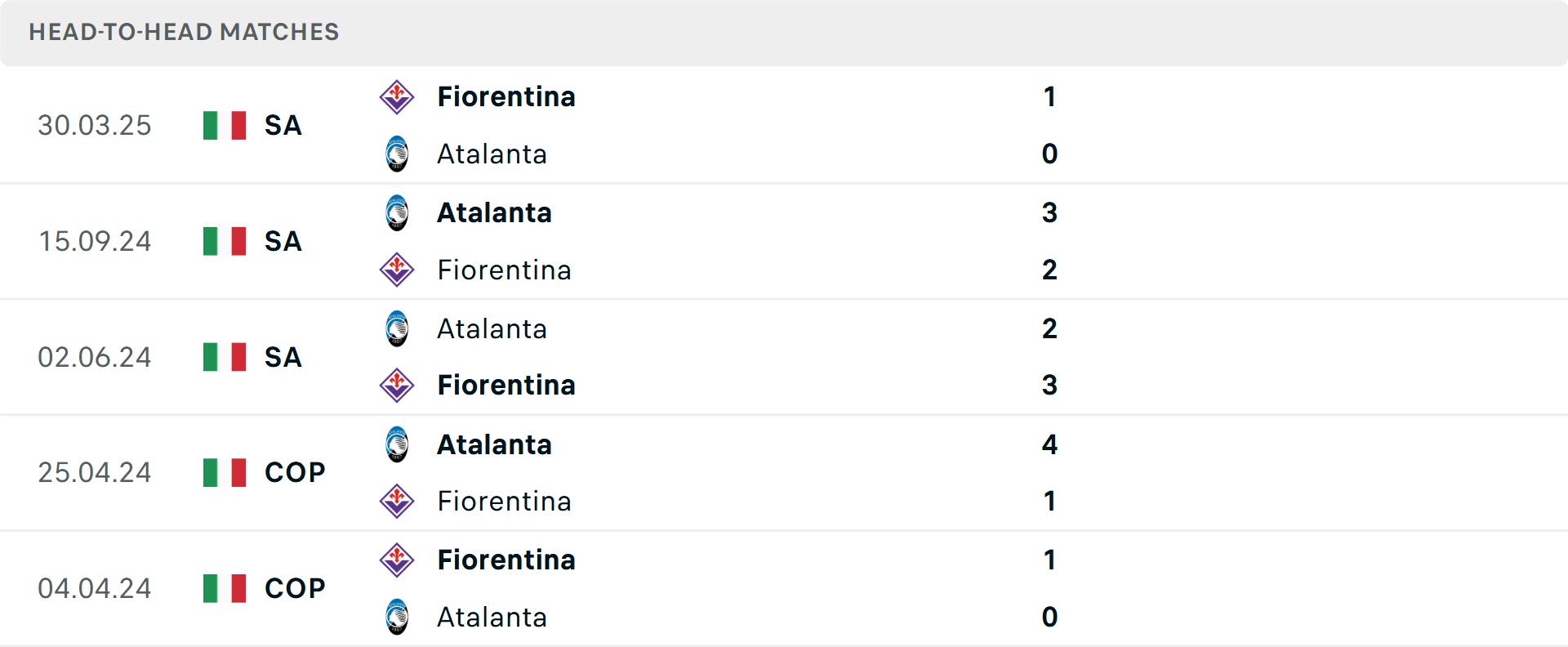 Tỷ lệ trận đấu: Atalanta thắng 2 và thua 2 trong 4 trận gần đây theo tỷ số châu Á. Phía bên kia, Fiorentina thua 8/10 trận trước đó.