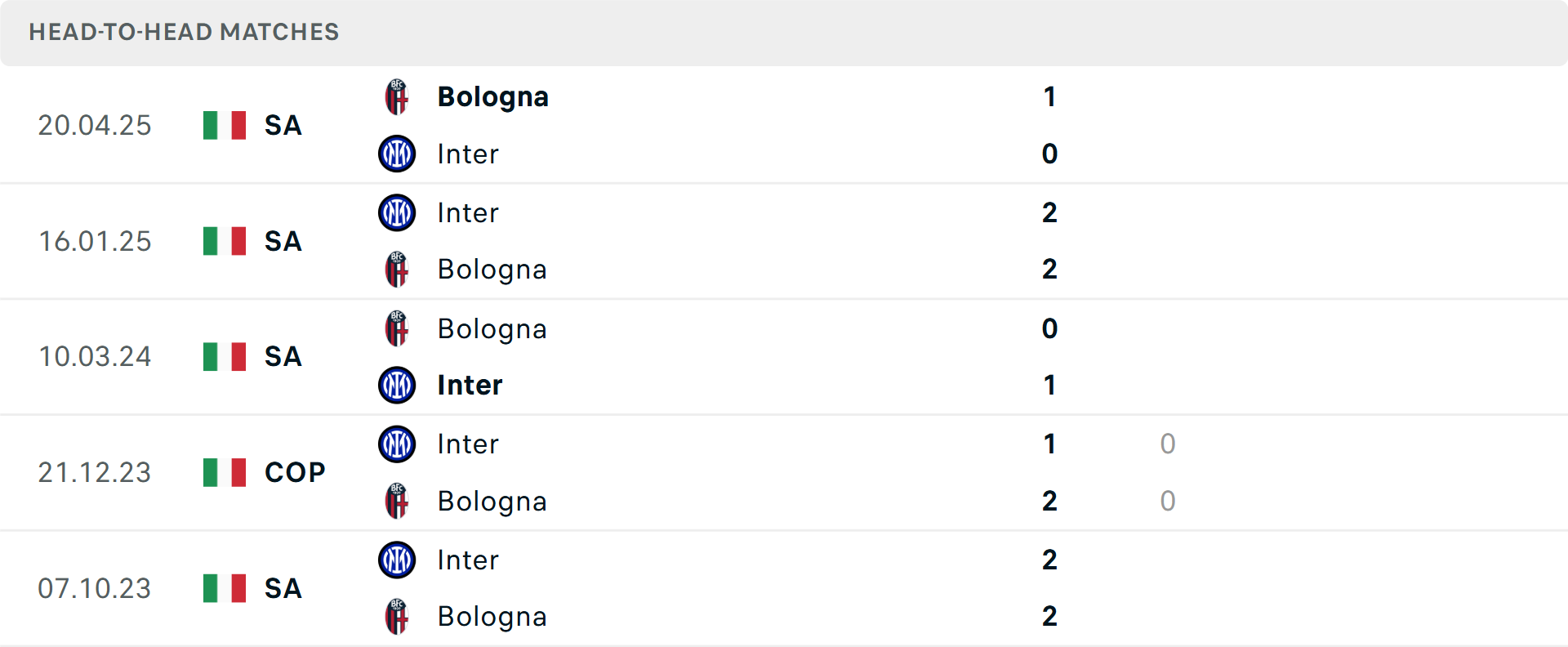 Tổng bàn thắng cả trận: Bologna trải qua 6 trận liên tiếp không giữ sạch lưới. Về phần mình, 3/4 trận gần đây của Inter Milan vượt mốc tổng bàn thắng.