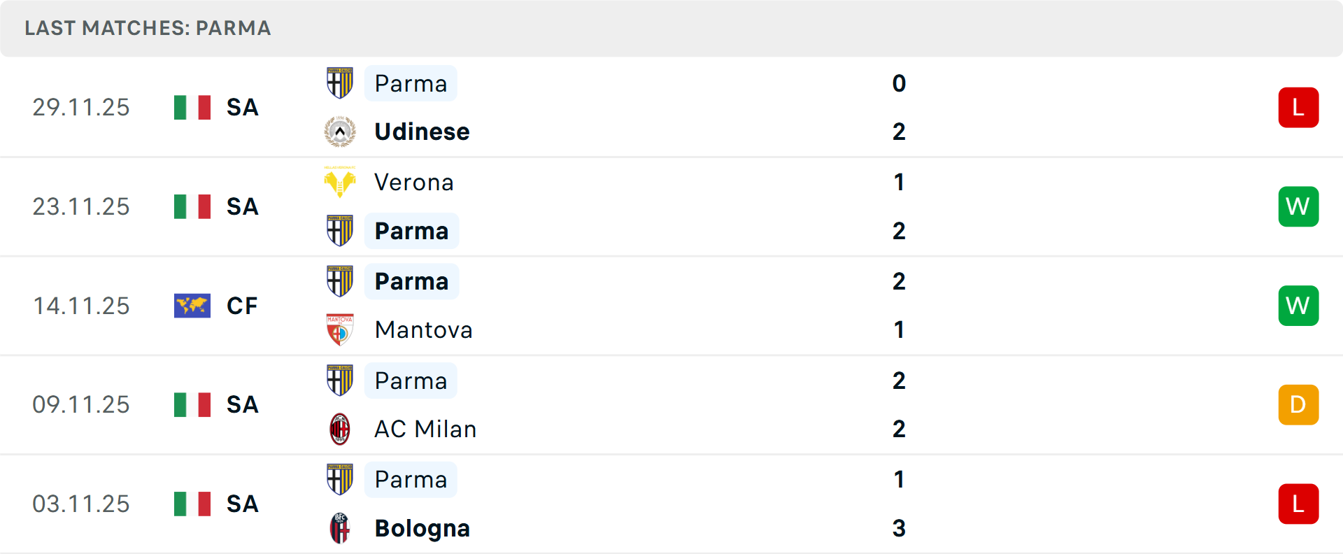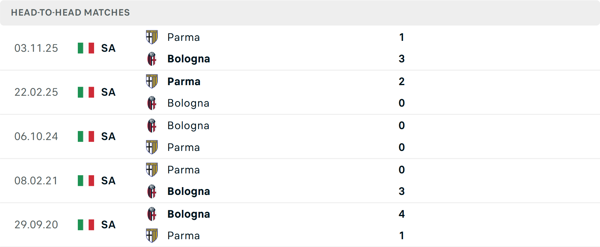 Bologna đã thắng Parma 3-1 trong lần chạm trán gần nhất vào tháng 11. Dù Parma, đội đang rất muốn trả mối thù này và tìm kiếm cú hích tinh thần sau thất bại 0-2 trước Udinese tại Serie A. Tuy nhiên, phong độ gần đây của Parma (chỉ thắng một trận từ tháng 9) không đủ để làm khó chủ nhà.