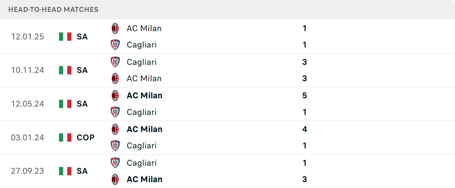 Tổng bàn thắng cả trận: 4/5 cuộc đối đầu trước đó giữa hai đội vượt mốc tổng bàn thắng, tương tự là 3 trận gần đây của Cagliari và 3/4 trận mới nhất của AC Milan.