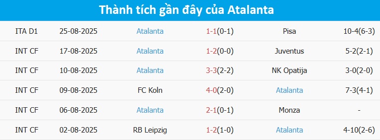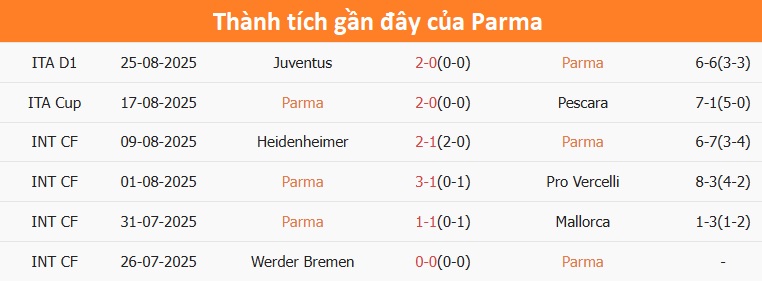 Tỷ lệ trận đấu: Parma thắng 1 và thua 1 trong 2 trận chính thức từ đầu mùa theo tỷ số châu Á. Về phần mình, Atalanta trải qua 4 trận thua liên tiếp.