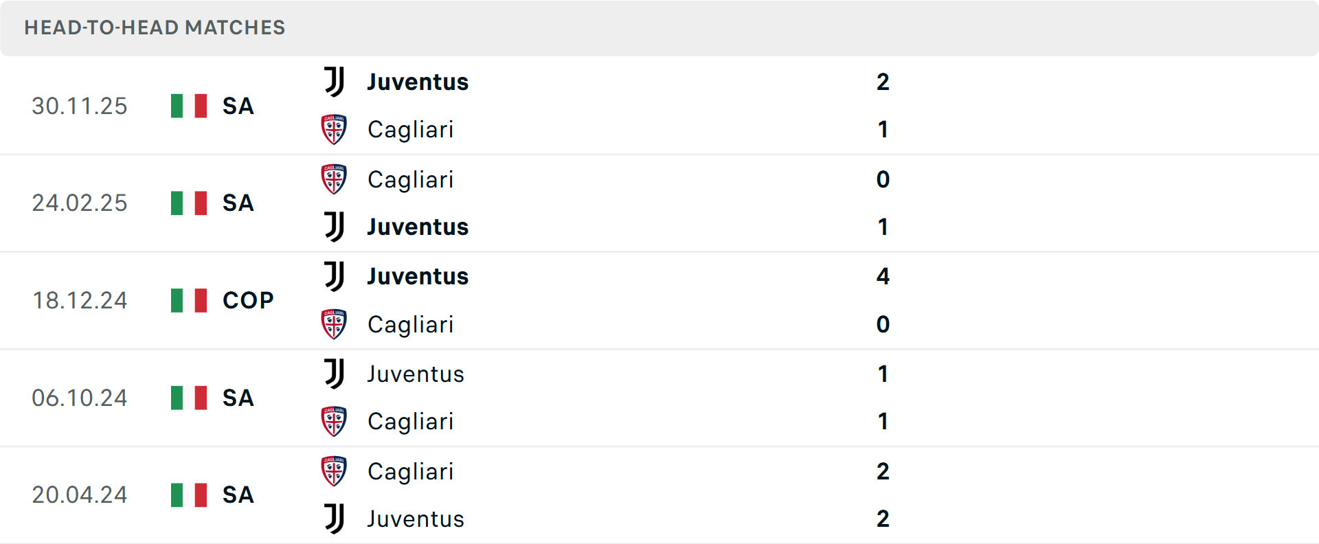 Tổng bàn thắng cả trận: 5/7 cuộc đối đầu mới nhất giữa hai đội vượt mốc tổng bàn thắng, tương tự là 5/6 trận gần đây của Cagliari và 2 trận vừa qua của Juventus.