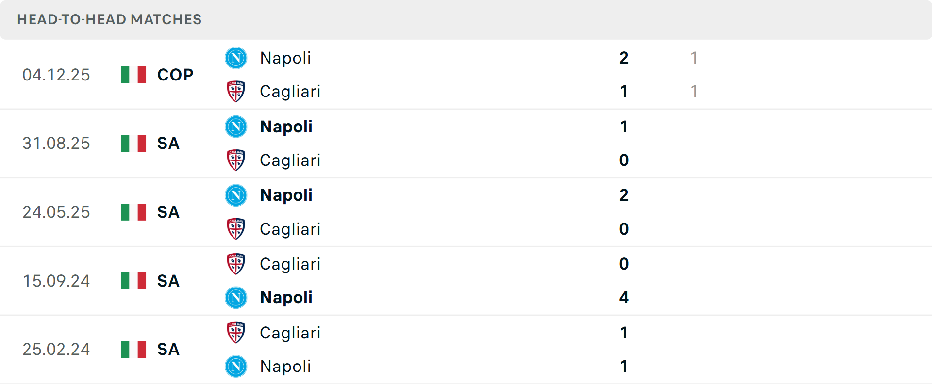 Tổng bàn thắng cả trận: Cả 2 trận mới nhất của Cagliari đều vượt mốc tổng bàn thắng, tương tự là 9/10 trận gần đây của Napoli.