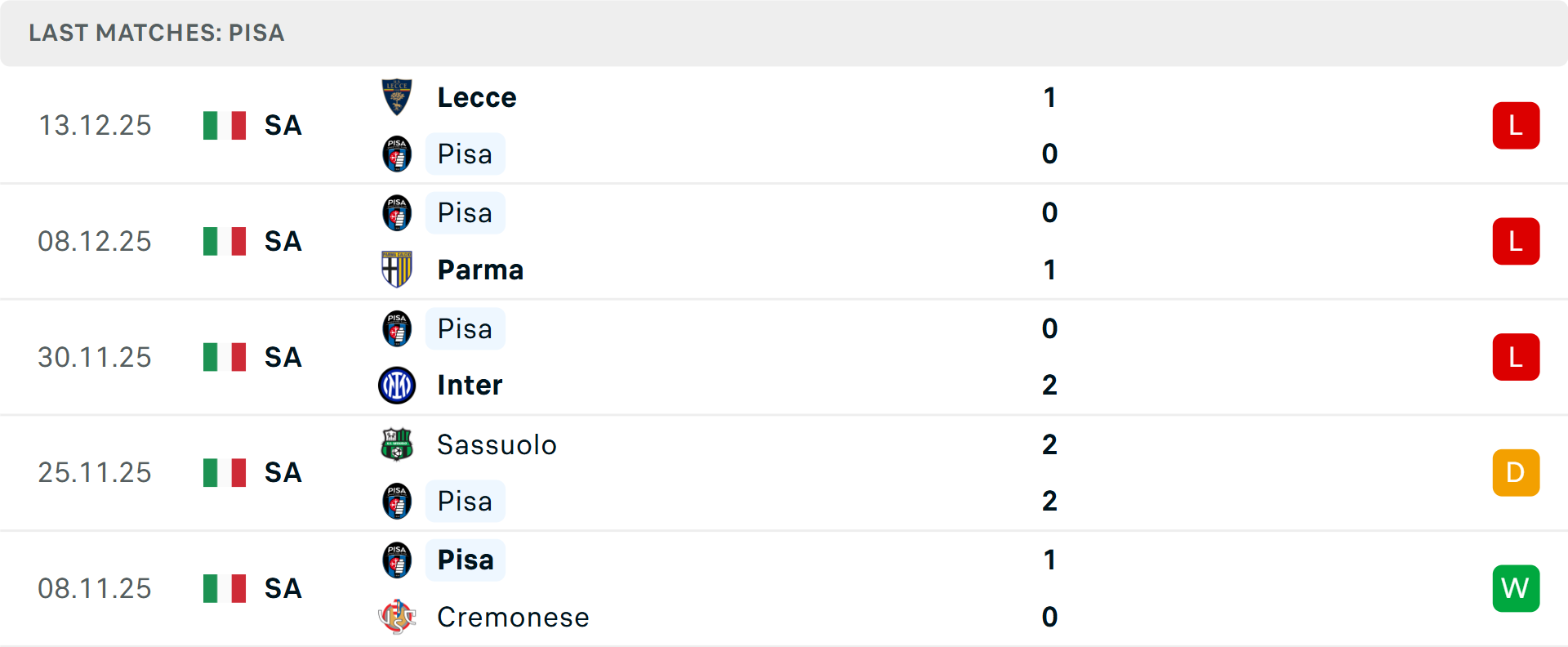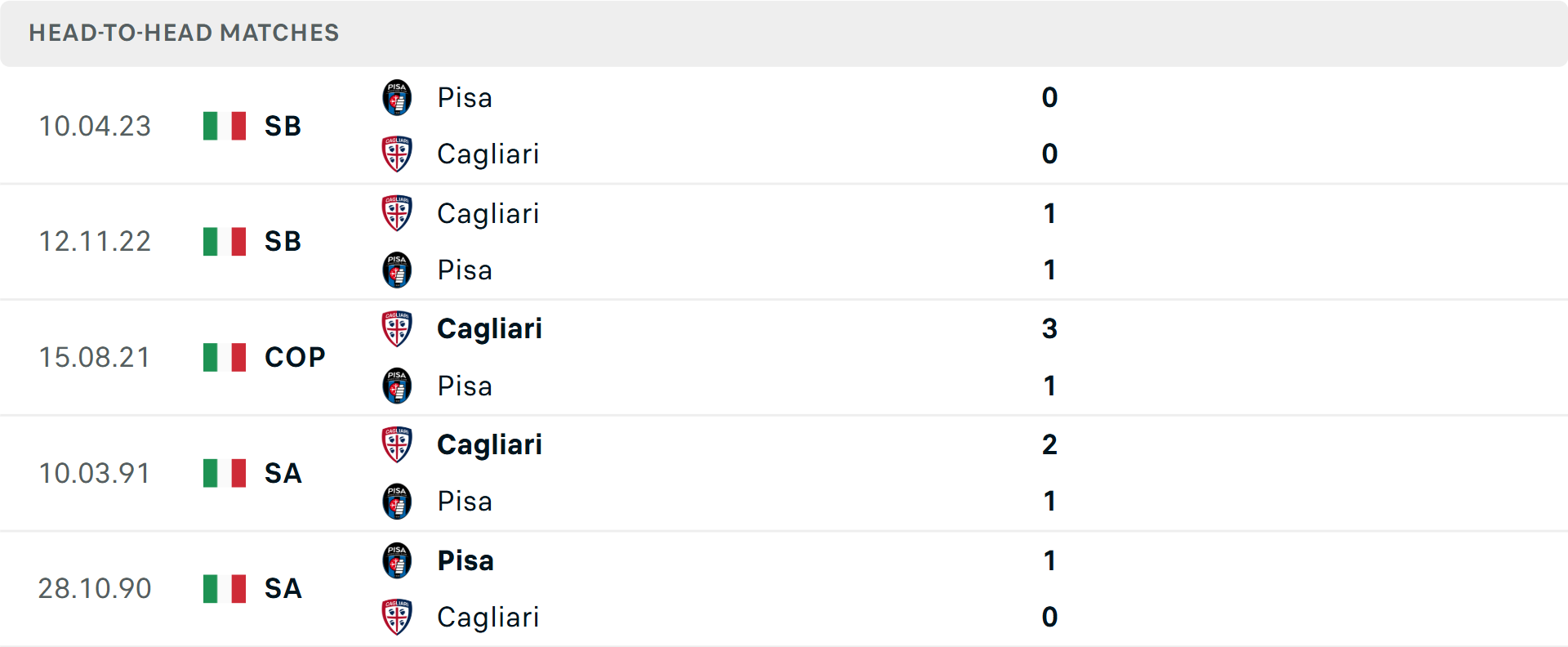 Ngược lại, Pisa của huấn luyện viên Alberto Gilardino đang lún sâu vào khủng hoảng với 3 trận thua liên tiếp và không ghi nổi bàn thắng nào. Việc thiếu vắng các trụ cột do chấn thương và bận tham dự CAN khiến đội khách càng thêm suy yếu. Lịch sử đối đầu cũng không ủng hộ Pisa khi họ chưa từng thắng tại Sardegna Arena. Trong bối cảnh cả hai đều chơi thận trọng, một bàn thắng duy nhất có thể định đoạt trận đấu.