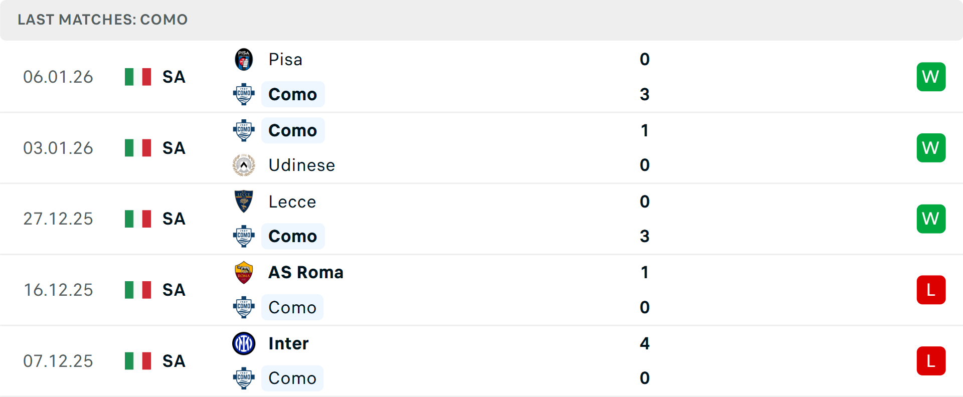 Como đang là hiện tượng thú vị nhất tại Serie A mùa này dưới sự dẫn dắt của Cesc Fabregas. Với vị trí thứ 6 và chỉ kém đội đầu bảng Inter 9 điểm, họ cho thấy sự thăng tiến vượt bậc. Điểm tựa lớn nhất của Como chính là hàng phòng ngự "thép" khi mới chỉ lọt lưới 12 bàn, tốt nhất giải đấu cùng chuỗi hơn 300 phút giữ sạch lưới. Tại "pháo đài" Sinigaglia, Como vẫn duy trì thành tích bất bại với 6 chiến thắng từ đầu mùa.