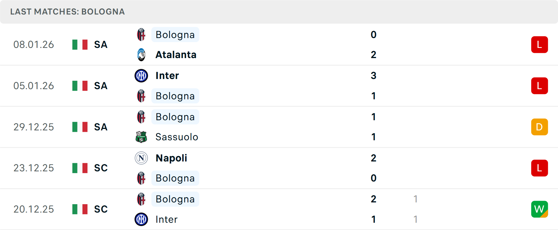 Ngược lại, Bologna đang chìm trong khủng hoảng với chuỗi 6 trận liên tiếp không thắng tại Serie A. Sau giai đoạn thăng hoa đầu mùa, đoàn quân của HLV Vincenzo Italiano dần sa sút và vừa để thua Atalanta 0-2 ngay tại sân nhà. Áp lực tâm lý cùng phong độ kém cỏi khiến khả năng cạnh tranh top 4 của Bologna bị lung lay dữ dội.