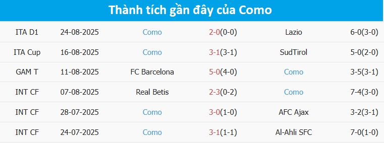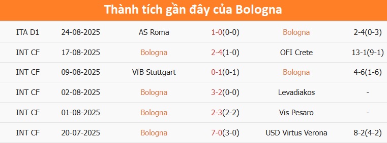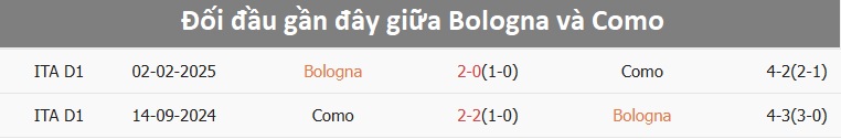 Tỷ lệ trận đấu: Bologna thua cả 2 trận mới nhất theo tỷ số châu Á. Về phần mình, Como thắng 6/7 trận gần đây, gồm cả hai trận chính thức.