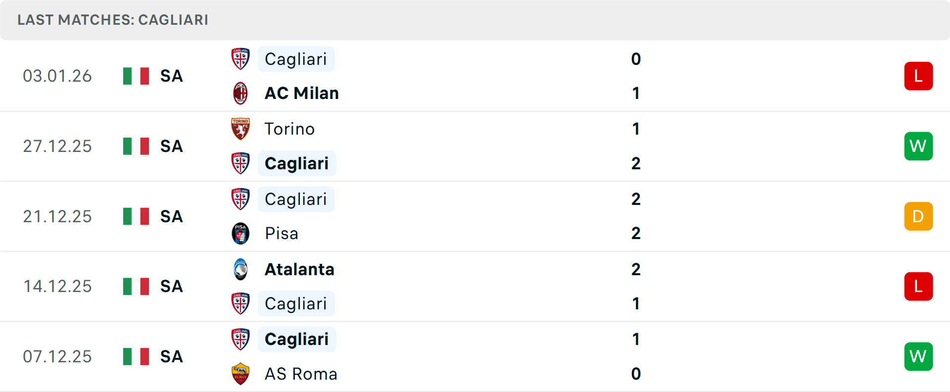 Phía bên kia chiến tuyến, Cagliari dưới sự dẫn dắt của HLV tân binh Fabio Pisacane đang nỗ lực bám đuổi chính đối thủ trên bảng xếp hạng. Hiện kém Cremonese 3 điểm, một chiến thắng sẽ giúp đại diện đảo Sardinia san bằng cách biệt. Dù vừa để thua AC Milan, nhưng phong độ sân khách cuối năm 2025 của Cagliari đã có sự cải thiện đáng kể.