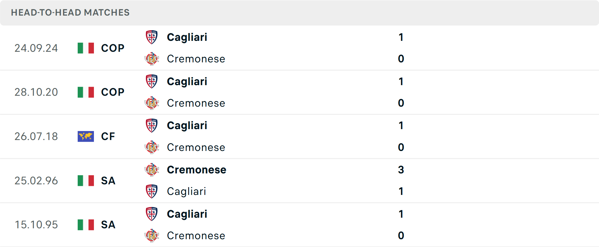 Lịch sử ủng hộ Cremonese với 3 trận thắng liên tiếp trên sân nhà trước Cagliari tại Serie A, nhưng đó đã là câu chuyện từ năm 1996. Với tương quan hiện tại, một kết quả hòa là kịch bản dễ xảy ra nhất.