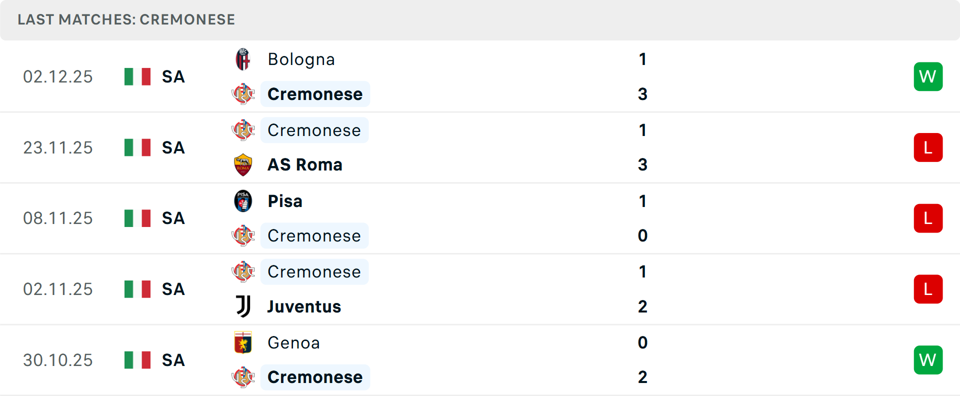 Cremonese vừa bất ngờ đánh bại Bologna 3-1 ngay trên sân khách, kết thúc chuỗi 12 trận bất bại của đối thủ. Phong độ thăng hoa của tiền đạo kỳ cựu Jamie Vardy giúp đội bóng của HLV Davide Nicola có 17 điểm, khởi đầu mùa giải tốt thứ hai trong lịch sử CLB. Tuy nhiên, họ chỉ có một chiến thắng duy nhất trên sân nhà ở Serie A mùa này.