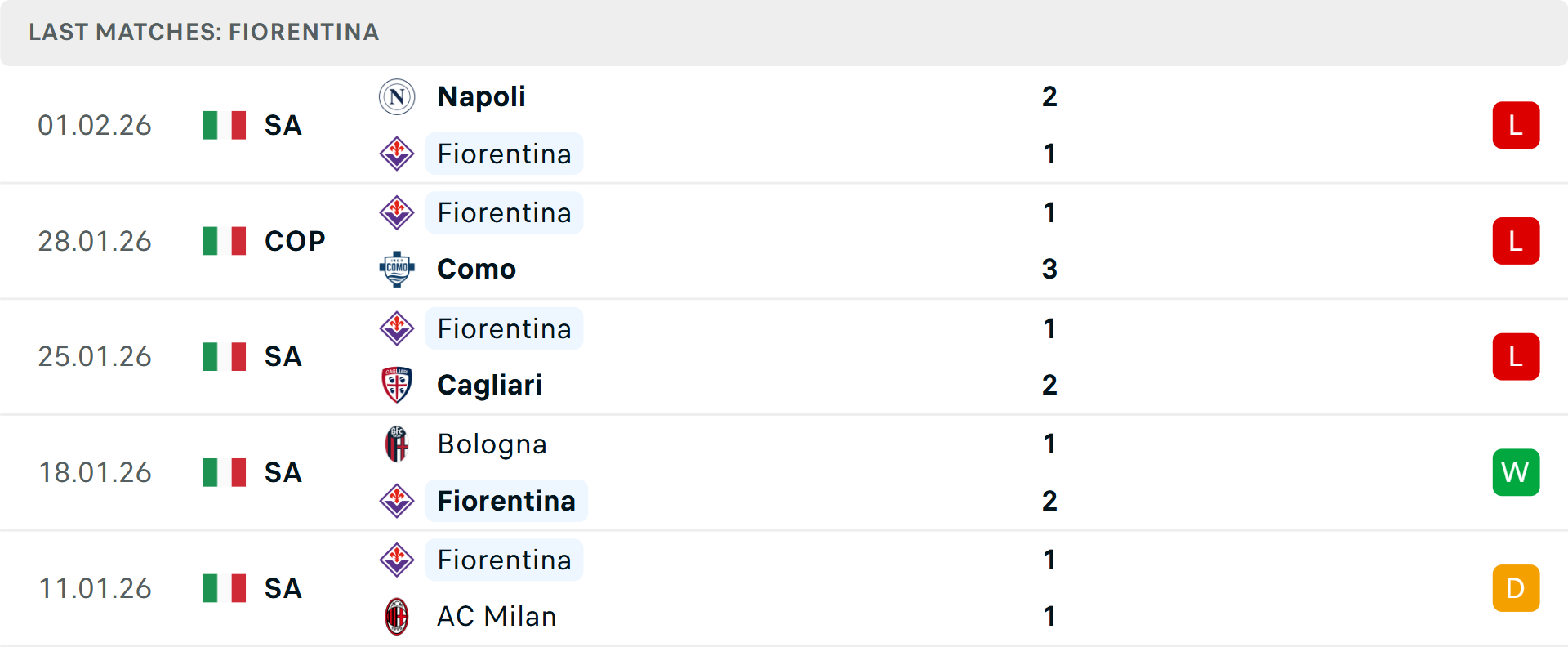 Fiorentina vừa trải qua chuỗi 3 thất bại liên tiếp, bao gồm cả việc bị loại khỏi Coppa Italia. Đội bóng của Paolo Vanoli hiện đang nằm trong nhóm cầm đèn đỏ, kém vị trí an toàn 1 điểm. Điểm yếu lớn nhất của họ là hàng thủ khi giữ sạch lưới ít nhất Serie A mùa này (3 trận).