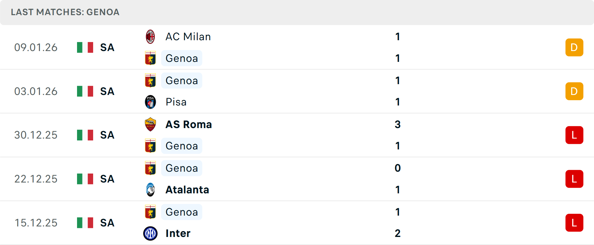 Genoa của HLV Daniele De Rossi đang trải qua giai đoạn khó khăn khi chỉ giành được 2 điểm sau 5 trận gần nhất. Đội chủ sân Marassi thường xuyên đánh rơi lợi thế, tiêu biểu là trận hòa tiếc nuối trước AC Milan mới đây. Thống kê chỉ ra Genoa đã để rơi tới 17 điểm khi đang ở thế dẫn bàn mùa này.