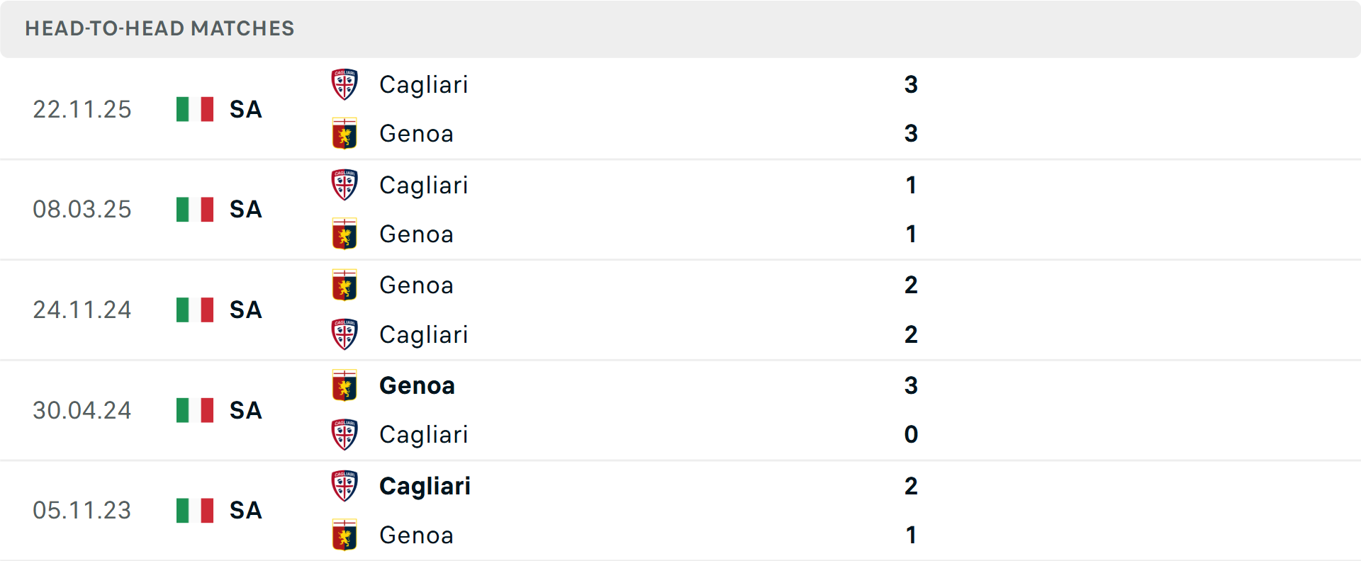 Tổng bàn thắng cả trận: 4/5 cuộc đối đầu mới nhất giữa hai đội vượt mốc tổng bàn thắng, tương tự là 7/10 trận gần đây của Genoa và 4/5 trận của Cagliari.