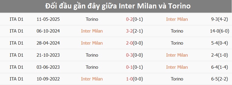 Tổng bàn thắng cả trận: 6/8 cuộc đối đầu trước đó giữa hai đội dưới mốc tổng bàn thắng. 6/7 trận gần đây của Inter Milan không vượt qua mốc này, tương tự là 6/10 trận của Torino.