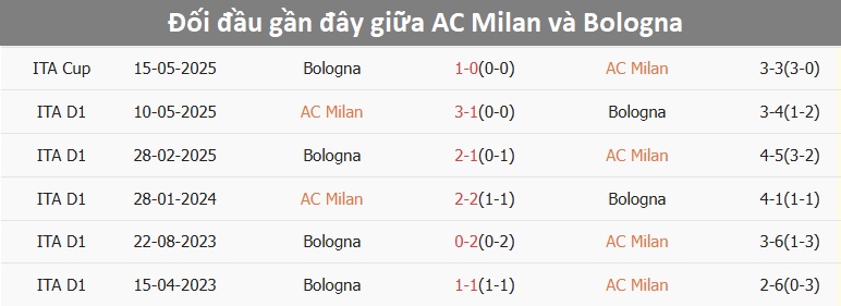 Tổng bàn thắng cả trận: Cả 3 trận vừa qua của AC Milan không vượt mốc tổng bàn thắng. Tương tự, 2 trận gần đây của Bologna chỉ có tối đa 1 bàn.