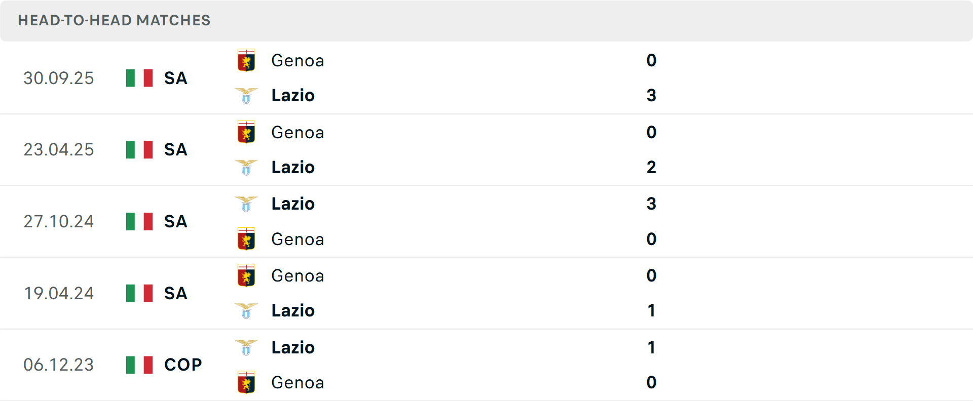 Tổng bàn thắng cả trận: 4/6 cuộc đối đầu mới nhất giữa hai đội dưới mốc tổng bàn thắng, tương tự là 7/10 trận gần đây của Lazio và cả 2 trận sân khách vừa qua của Genoa.