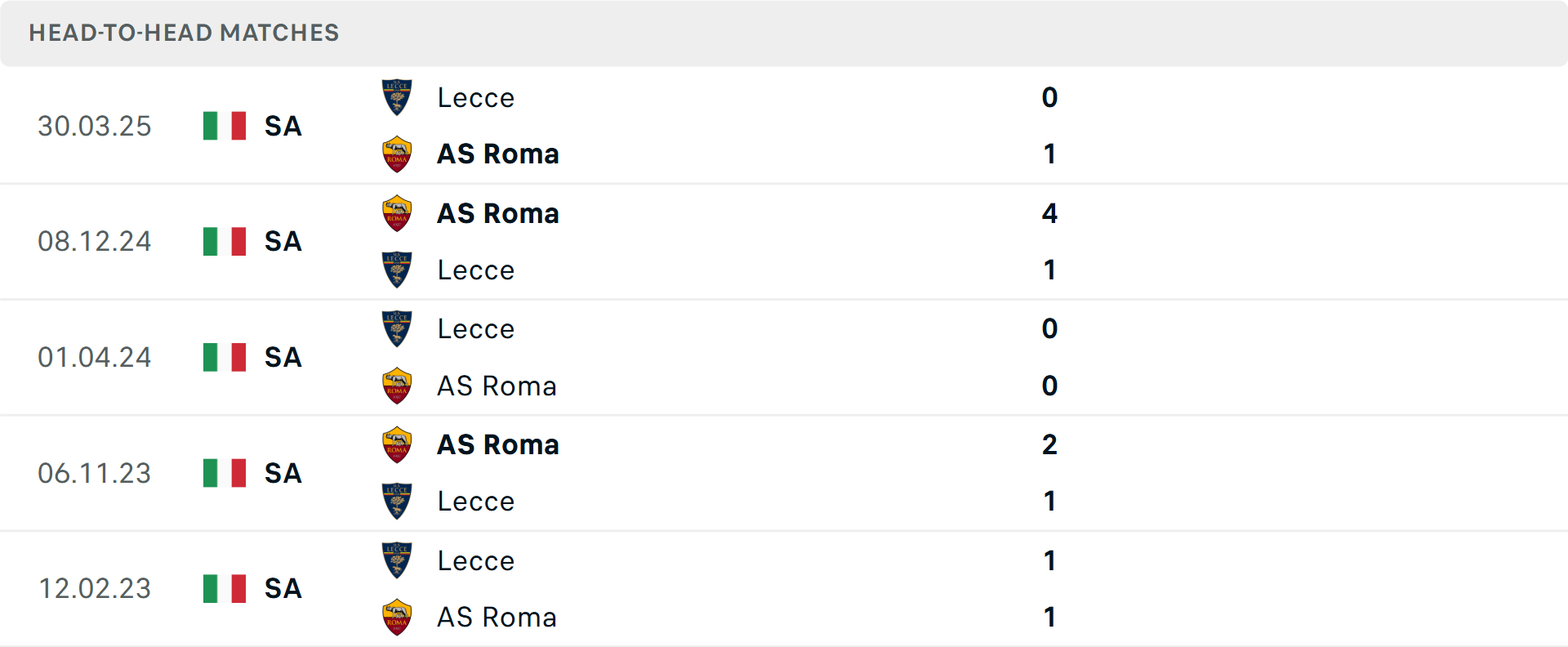Tỷ lệ trận đấu: Lecce thắng 3/5 trận gần đây theo tỷ số châu Á. Về phần mình, AS Roma thua 2/3 trận mới nhất.