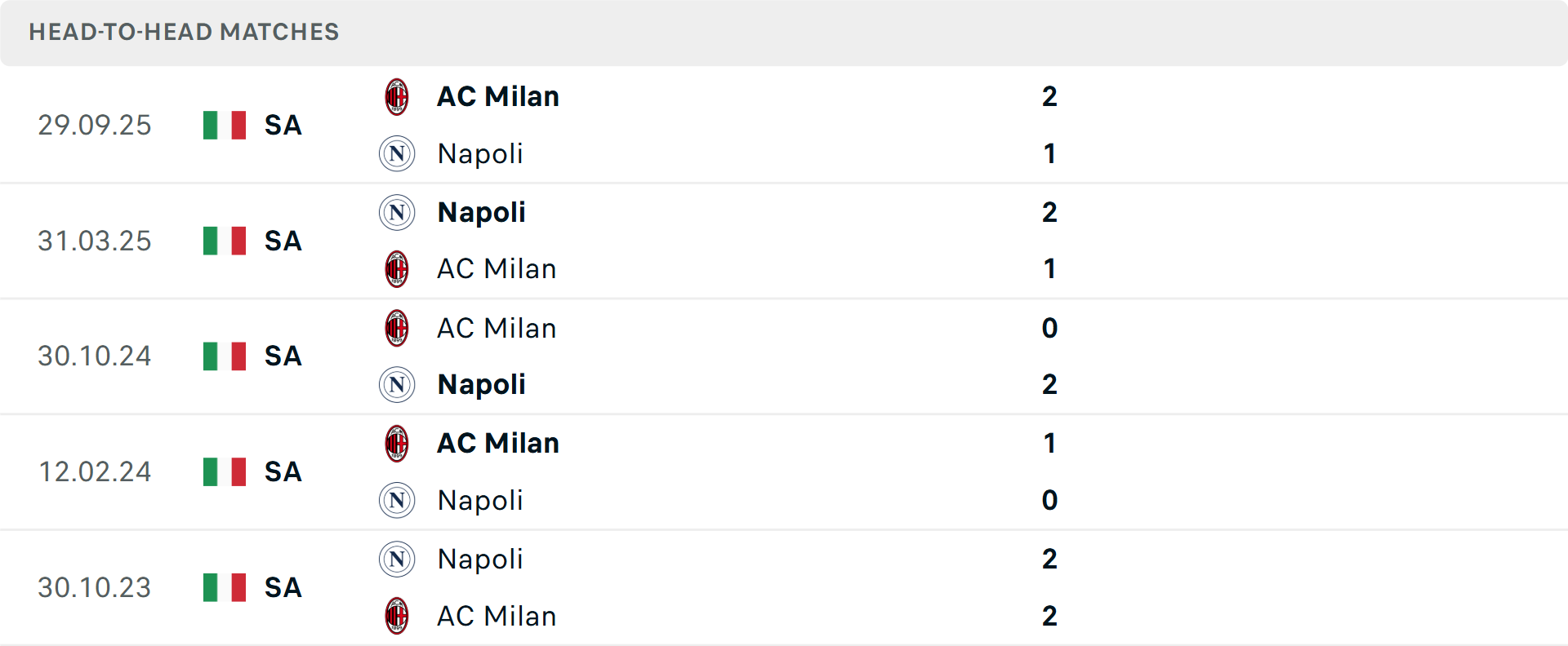 Tổng bàn thắng cả trận: Cả 2 cuộc đối đầu mới nhất giữa hai đội vượt mốc tổng bàn thắng, tương tự là 2 trận vừa qua của AC Milan. Về phần mình, Napoli trải qua 4 trận liên tiếp không giữ sạch lưới.