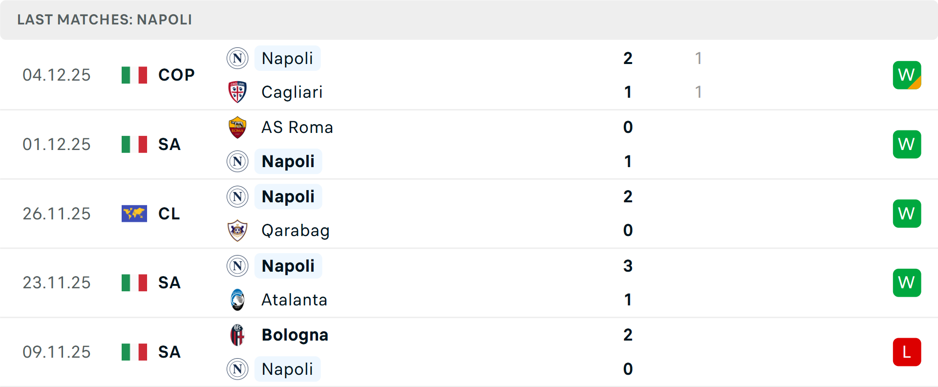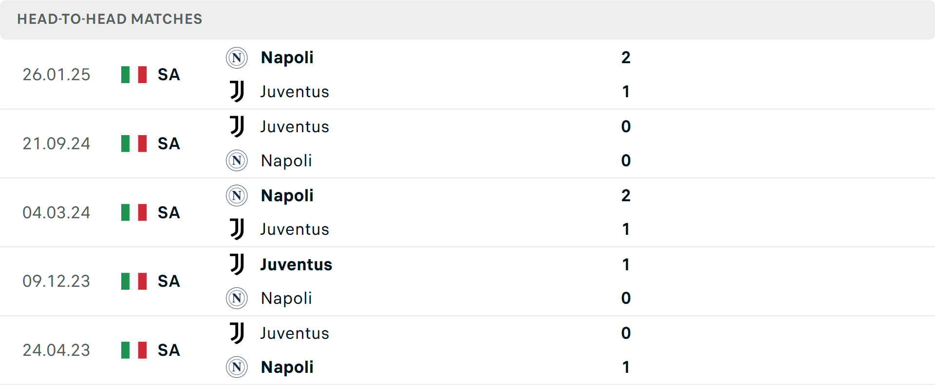 Thành tích đối đầu cũng nghiêng hẳn về phía đội bóng miền Nam khi đã thắng cả 6 lần gần nhất tiếp đón Juventus trên sân nhà. Dưới sự dẫn dắt của HLV Antonio Conte, Napoli đã thể hiện sự vượt trội so với đội bóng cũ của mình trong những năm gần đây.