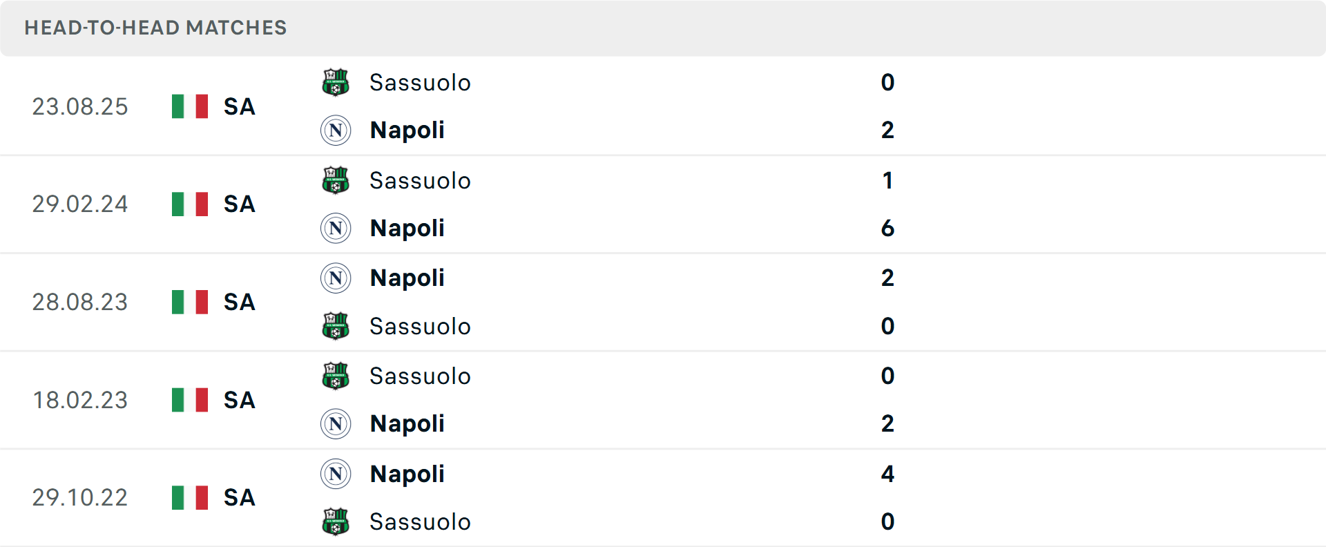 Tỷ lệ trận đấu: Napoli toàn thắng Sassuolo cả 6 cuộc đối đầu trước đó theo tỷ số châu Á. Napoli thắng 5/7 trận gần đây, trong khi Sassuolo thua cả 3 trận mới nhất.