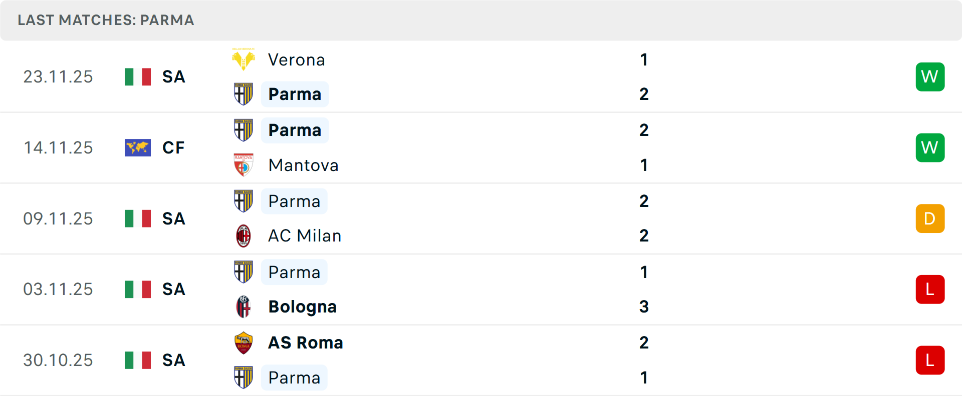 Parma đang cho thấy dấu hiệu hồi sinh với 4 điểm giành được trong 2 trận gần nhất, bao gồm trận hòa 2-2 với AC Milan và chiến thắng 2-1 trước Hellas Verona. Với cú đúp của chân sút hàng đầu Mateo Pellegrino, đội bóng của Carlos Cuesta đã ghi 6 bàn trong 4 trận gần nhất, sau khi chỉ ghi 3 bàn trong 8 vòng đầu.