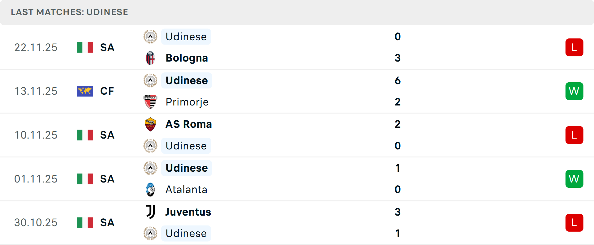 Ngược lại, Udinese vừa nhận thất bại thảm hại 0-3 trước Bologna. Dù là đối thủ "ưa thích" của Udinese trong lịch sử (giành 21 trận thắng và ghi 74 bàn), đội bóng của Kosta Runjaic đang có hàng phòng ngự tệ thứ hai giải đấu khi thủng lưới 20 bàn. Họ cũng đã tịt ngòi trong 230 phút gần nhất.