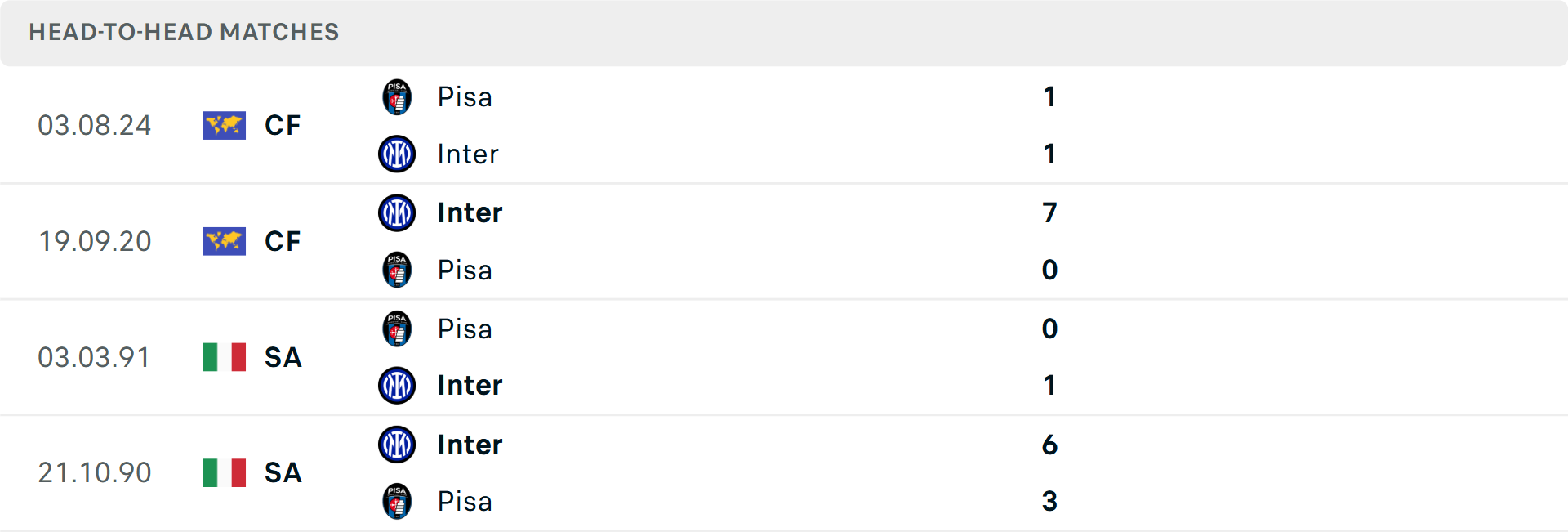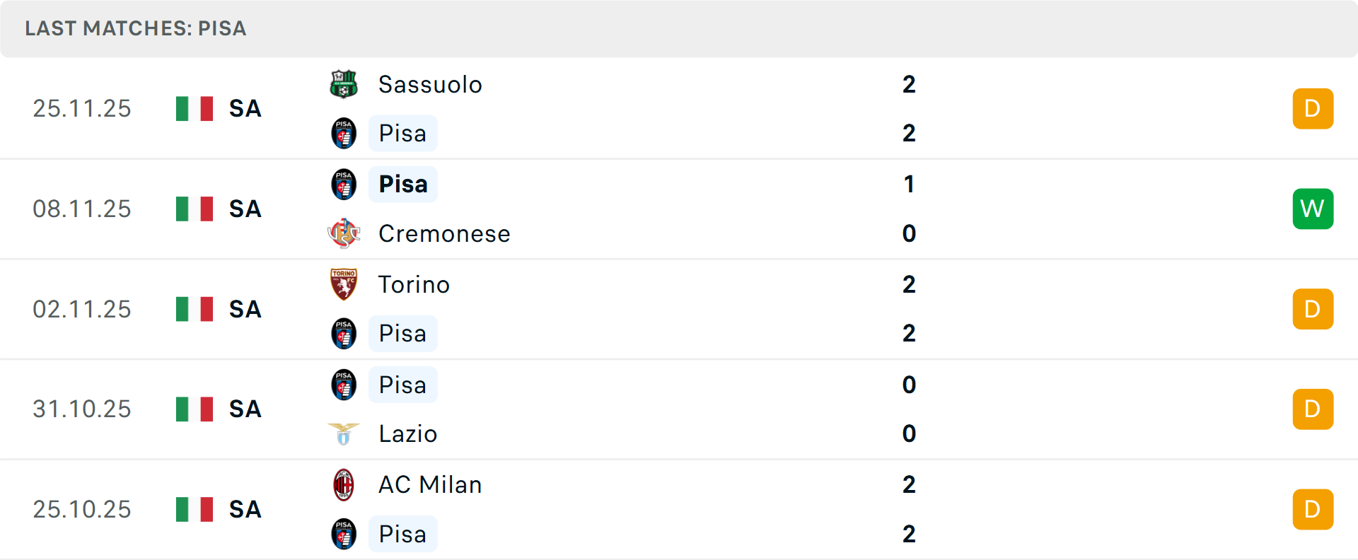 Đội mới thăng hạng Pisa lại đang có phong độ tốt. Họ bất bại trong 6 trận gần nhất tại Serie A và đang hướng tới kỷ lục lịch sử của câu lạc bộ. Đáng chú ý, sân nhà Arena Garibaldi là một pháo đài khi đã giữ sạch lưới trong suốt 436 phút gần đây. Tuy nhiên, Pisa vẫn là đội phải nhận nhiều cú sút nhất giải đấu (196 lần).