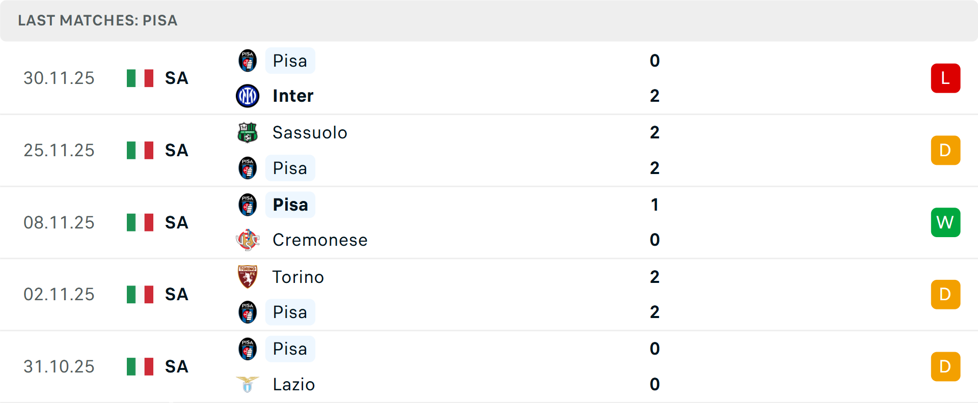 Pisa vừa chấm dứt chuỗi 6 trận bất bại (chủ yếu là hòa) bằng thất bại 0-2 trước Inter Milan. Đội bóng tân binh này đang đứng thứ 18, chỉ kém nhóm an toàn 1 điểm. Vấn đề lớn nhất của HLV Gilardino là hiệu suất ghi bàn kém cỏi trên sân nhà Arena Garibaldi, nơi họ chỉ ghi được 1 bàn sau 7 trận (thắng 1-0 trước Cremonese). Sân nhà của họ có tổng cộng chỉ 5 bàn thắng được ghi, thấp nhất Serie A.