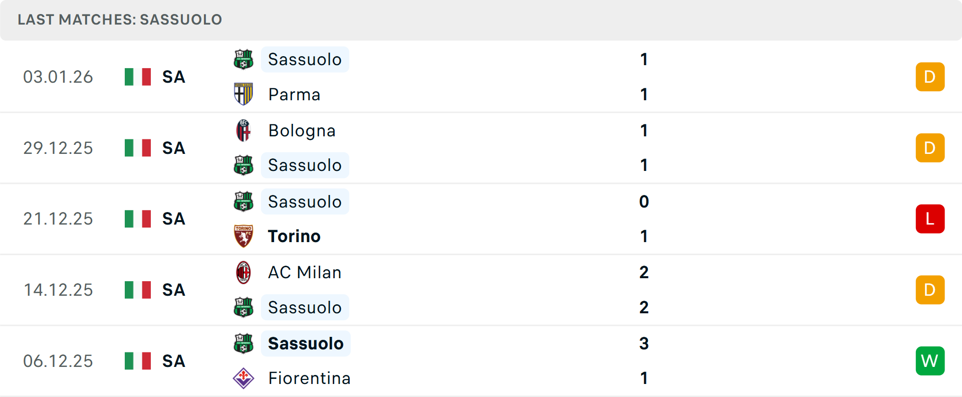 Trong khi đó, Sassuolo của Fabio Grosso đang gây ấn tượng ở vị trí thứ 10. Đội bóng vùng Emilia luôn là "khắc tinh" của Juve khi từng thắng cả hai lần đối đầu gần nhất tại Reggio Emilia. Dù đang trải qua chuỗi trận hòa liên tiếp trước Bologna và Parma, nhưng với những ngôi sao như Berardi hay Thorstvedt, Sassuolo đủ khả năng gây khó dễ cho bất kỳ ông lớn nào. Trong bối cảnh Juve chưa tìm lại sự sắc bén và Sassuolo chơi kiên cường trên sân nhà, tỷ số hòa dễ xảy ra.