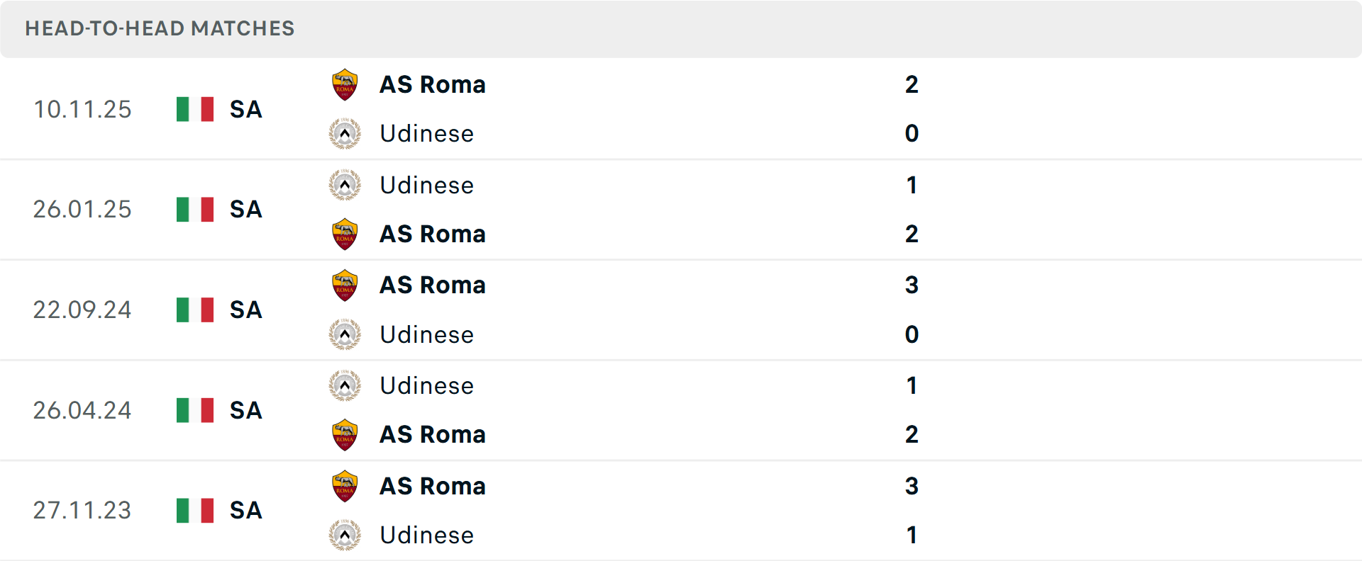 Tổng bàn thắng cả trận: Cả 4 trận gần đây của AS Roma đều dưới mốc tổng bàn thắng, chỉ ghi tối đa 1 bàn ở 2 trận mới nhất.