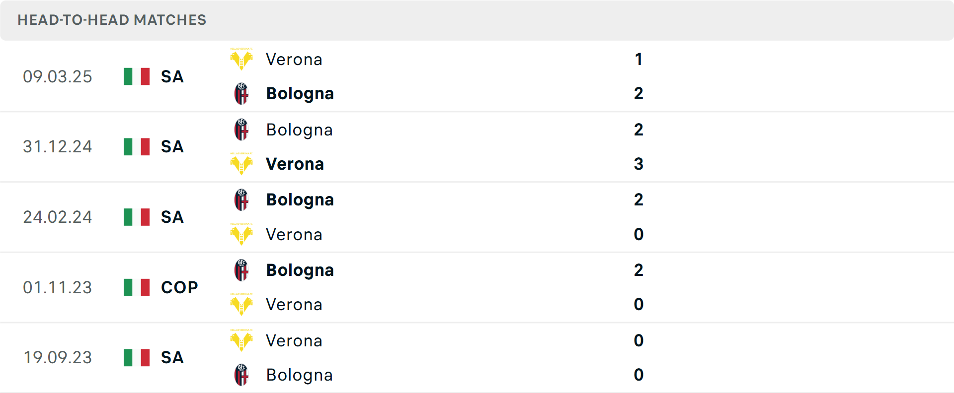 Tổng bàn thắng cả trận: Verona không ghi bàn ở 3/4 trận vừa qua. Về phần mình, 6/7 trận gần đây của Bologna dưới mốc tổng bàn thắng.