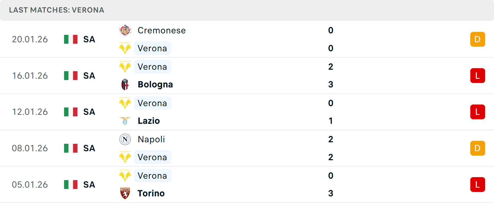 Sau trận hòa không bàn thắng trước Cremonese, Verona vẫn dậm chân ở vị trí thứ 19 với vỏn vẹn 14 điểm. Lịch sử chỉ ra rằng trong cả hai lần Hellas có thành tích tệ hại tương tự tại giai đoạn này, họ đều phải xuống hạng. Khó khăn chồng chất khi "ngòi nổ" sáng tạo Giovane sắp rời đi, trong khi đội bóng đã thua cả 3 trận sân nhà gần nhất.
