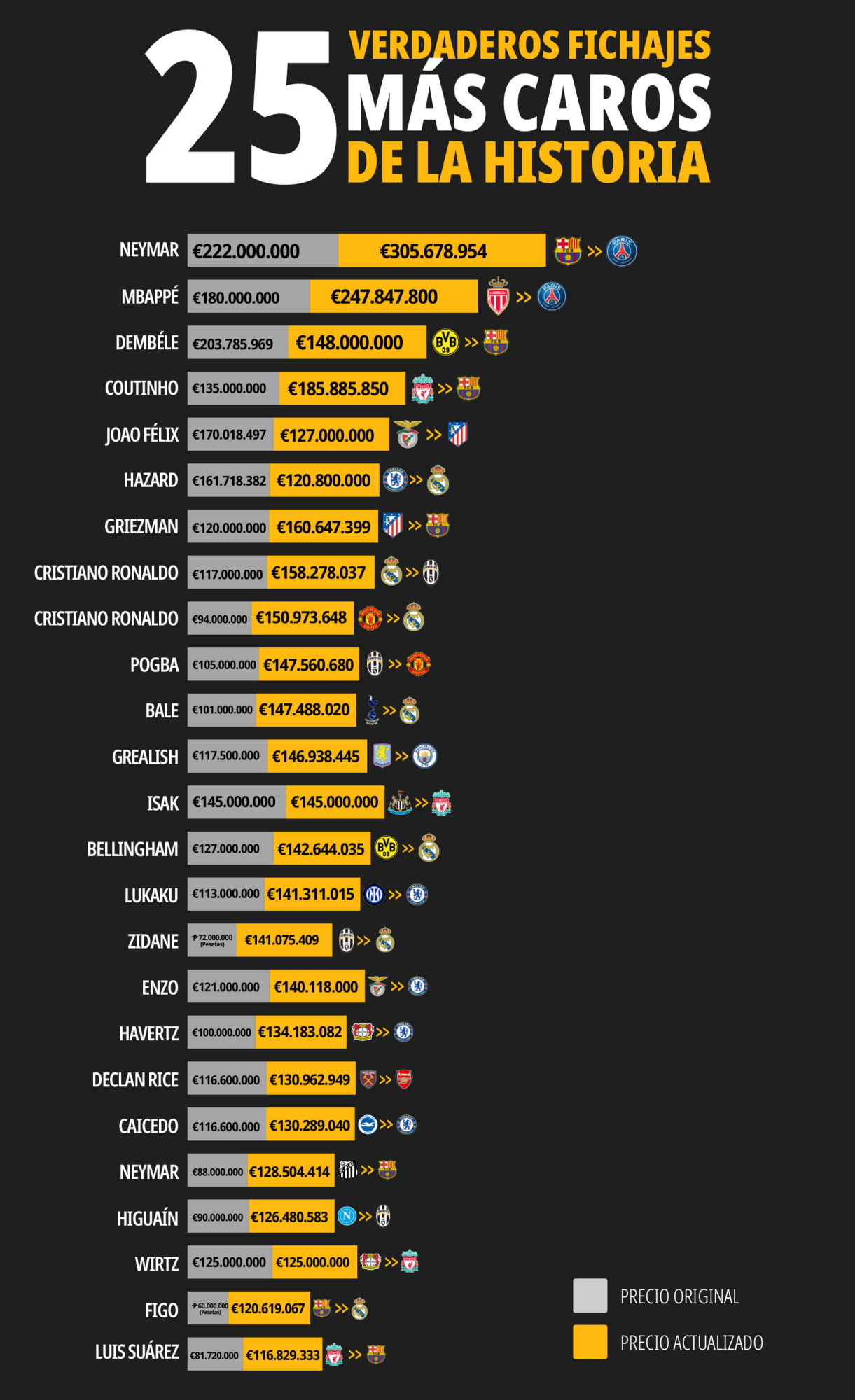 Trong bảng danh sách này, Neymar vẫn giữ vị thế hàng đầu với giá trị quy đổi lên tới 305 triệu euro. Tuy nhiên, "ông vua" thực sự về dòng tiền chính là Cristiano Ronaldo. Tổng giá trị cập nhật cho cả hai thương vụ khi Real Madrid mua anh và sau đó bán anh sang Juventus đều đạt mức 308 triệu euro mỗi lần.