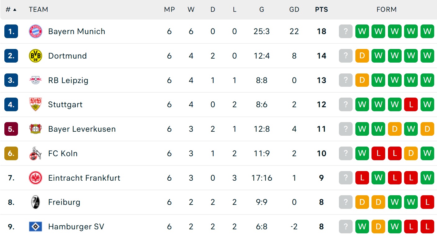 Vẫn chưa có đối thủ nào ngăn cản được Bayern Munich khi nhà đương kim vô địch tiếp tục toàn thắng, lần này là với tỷ số 3-0 trên sân Frankfurt. Như vậy, Bayern đã ghi tới 25 bàn sau 6 trận và giành số điểm tuyệt đối.
