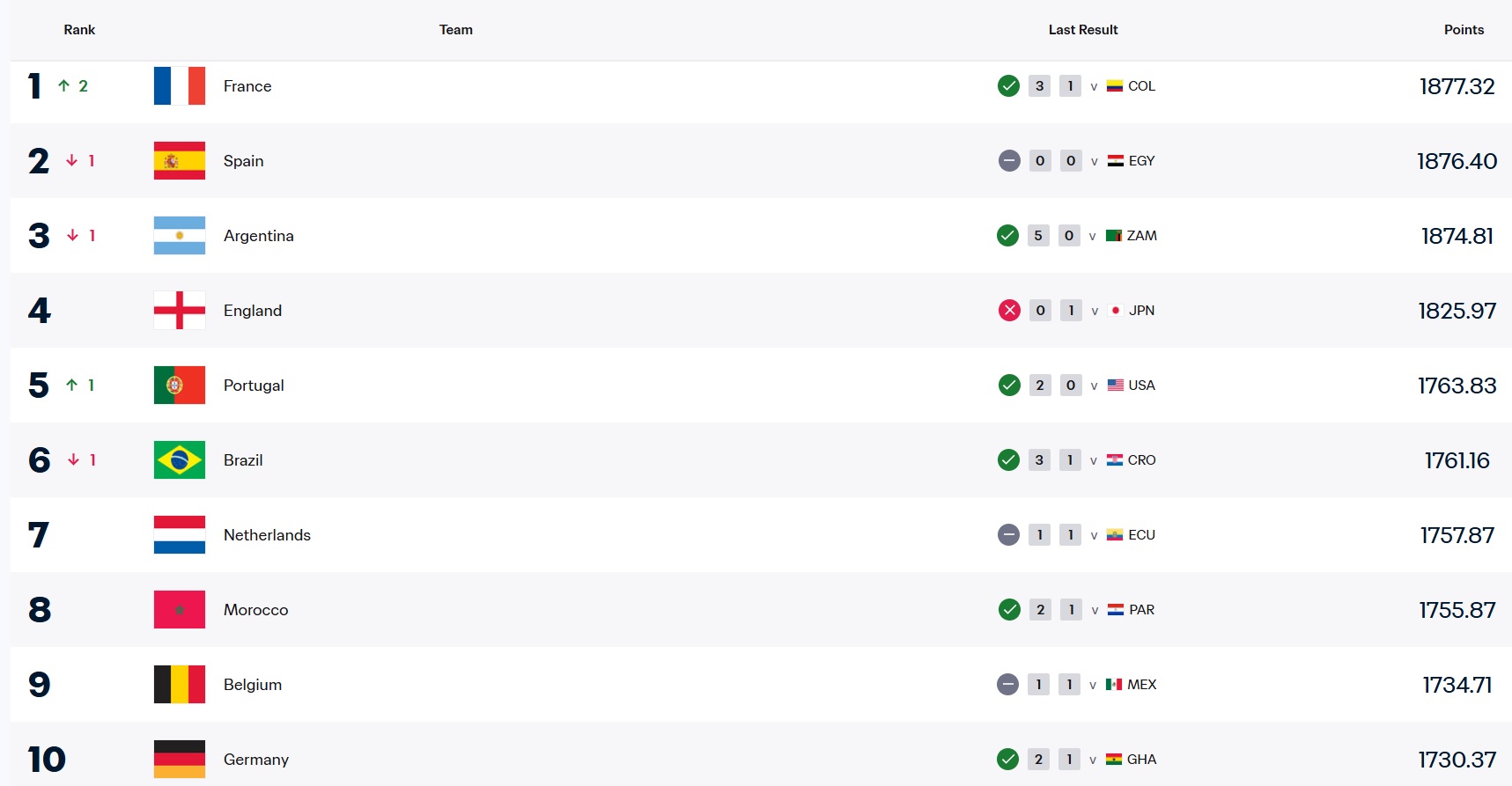 Sự thăng tiến của thầy trò huấn luyện viên Didier Deschamps đã đẩy Tây Ban Nha (hạng 2, giảm 1 bậc) và nhà đương kim vô địch thế giới Argentina (hạng 3, giảm 1 bậc) xuống các vị trí tiếp theo. Đáng chú ý, Tây Ban Nha đã không thể bảo vệ ngôi đầu mà họ nắm giữ từ tháng 9/2025 sau trận hòa đáng tiếc trước Ai Cập (hạng 29) vào ngày 31/3 vừa qua.