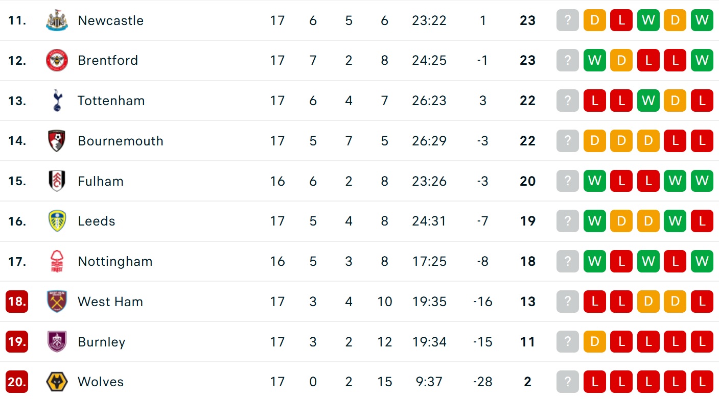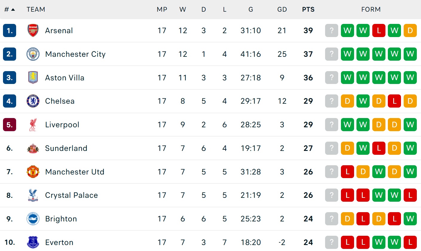Bảng xếp hạng Ngoại hạng Anh mới nhất