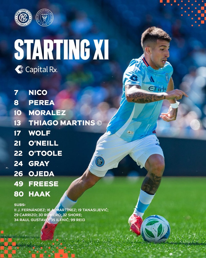 New York City: Matt Freese; Tayvon Gray, Kevin O'Toole, Thiago Martins, Raul Bicalho; Justin Haak, Andrés Perea; Nicolas Fernandez, Maximiliano Moralez, Hannes Wolf; Alonso Martinez
