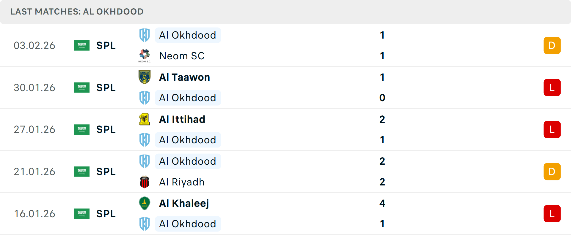 Al-Okhdood đang lún sâu ở vị trí thứ 17 với 13 thất bại sau 19 vòng đấu. Dù vừa thay tướng nhưng tân HLV Marius Sumudica vẫn chưa thể giúp đội nhà khởi sắc khi để thua tới 4 trong 7 trận gần nhất. Điểm tựa duy nhất của họ là thành tích thắng lợi hiếm hoi chỉ đến từ sân nhà.
