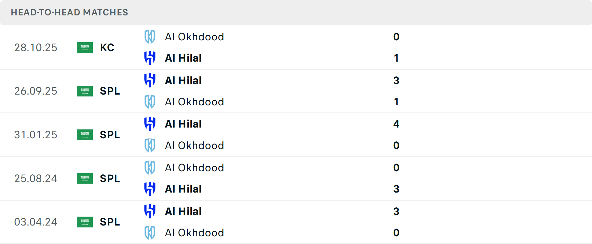 Lịch sử đối đầu đang nghiêng hẳn về phía đội khách với 6 chiến thắng liên tiếp trước Al-Okhdood. Dù đội chủ nhà sẽ nỗ lực phòng ngự để tìm kiếm hy vọng trụ hạng, nhưng đẳng cấp vượt trội của dàn sao Al Hilal sẽ sớm lên tiếng để giải tỏa cơn khát thắng.