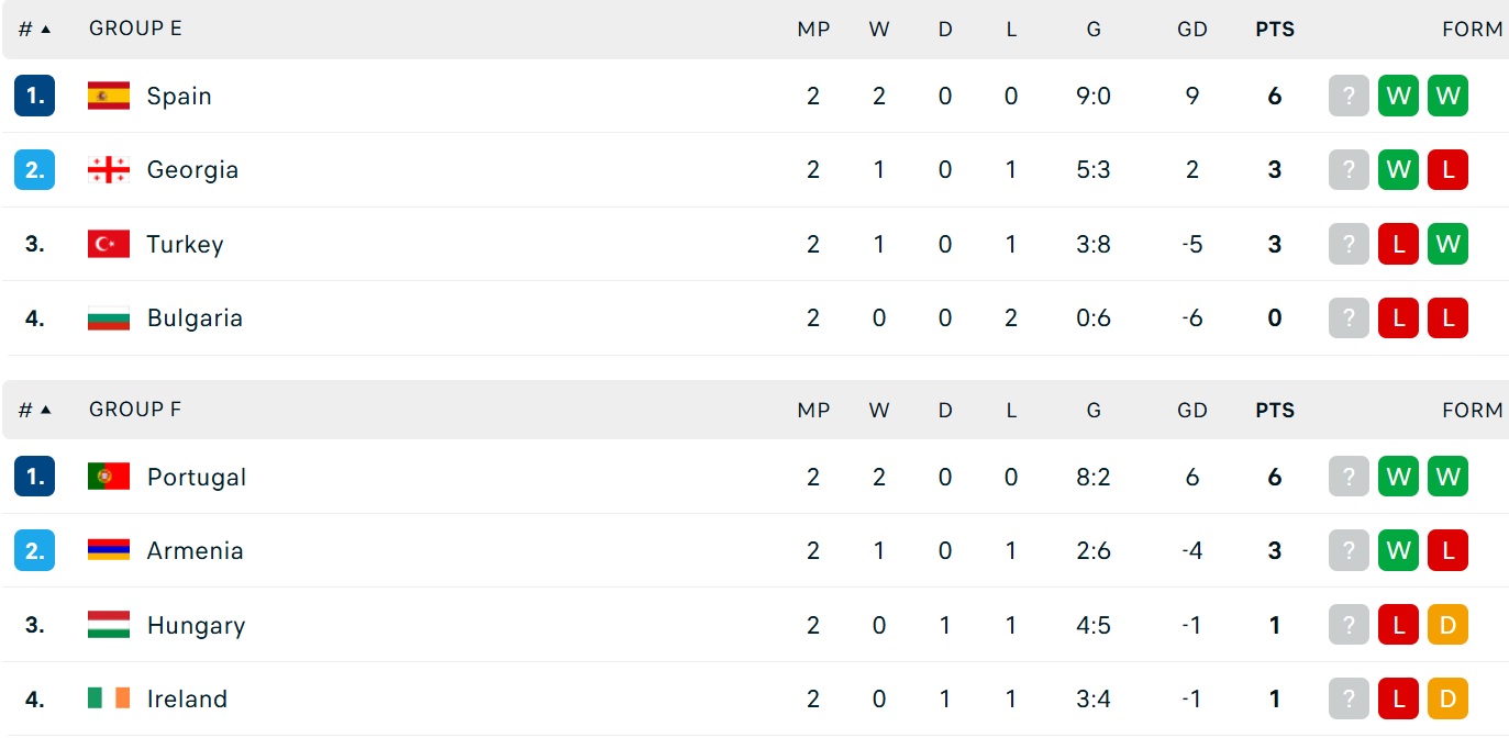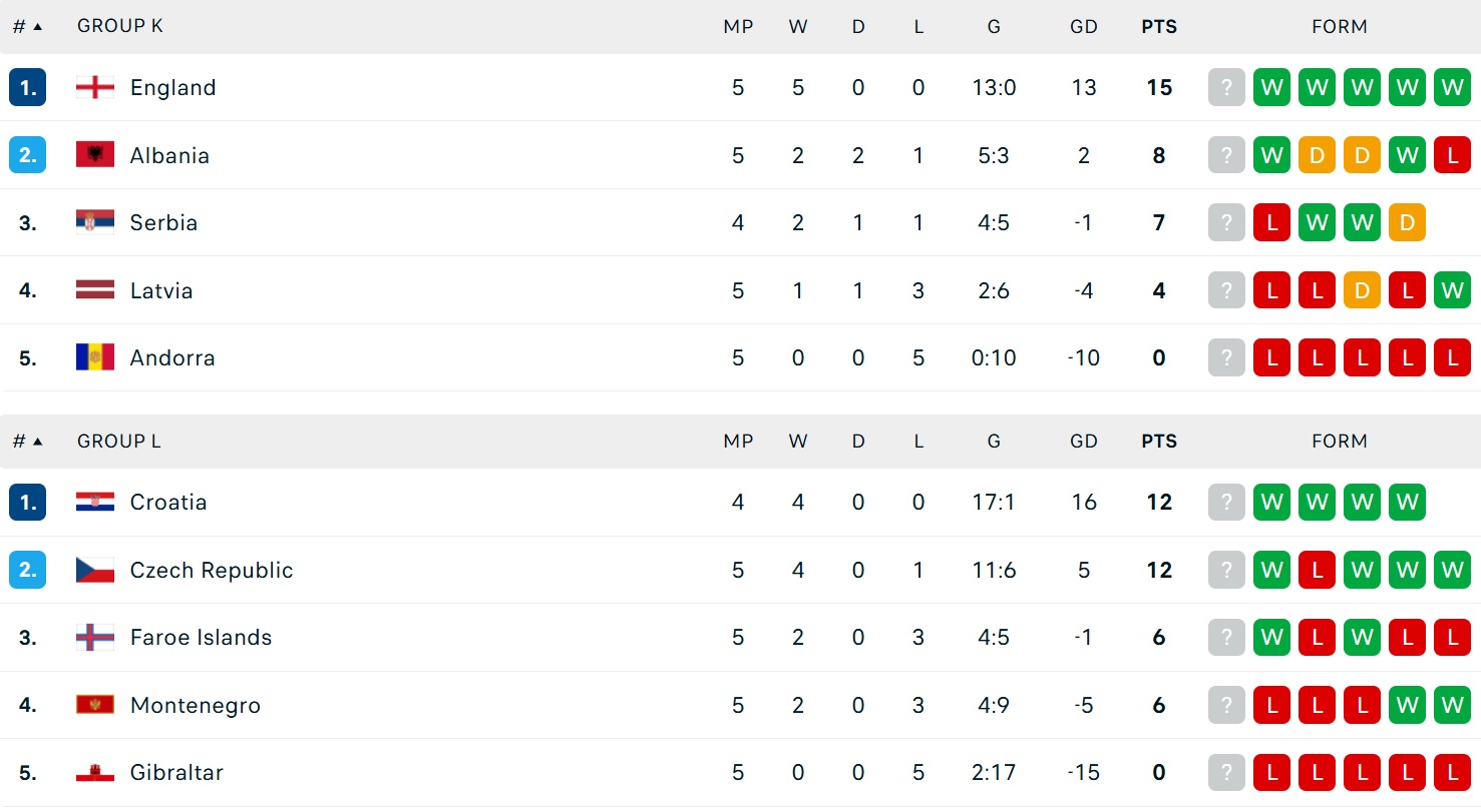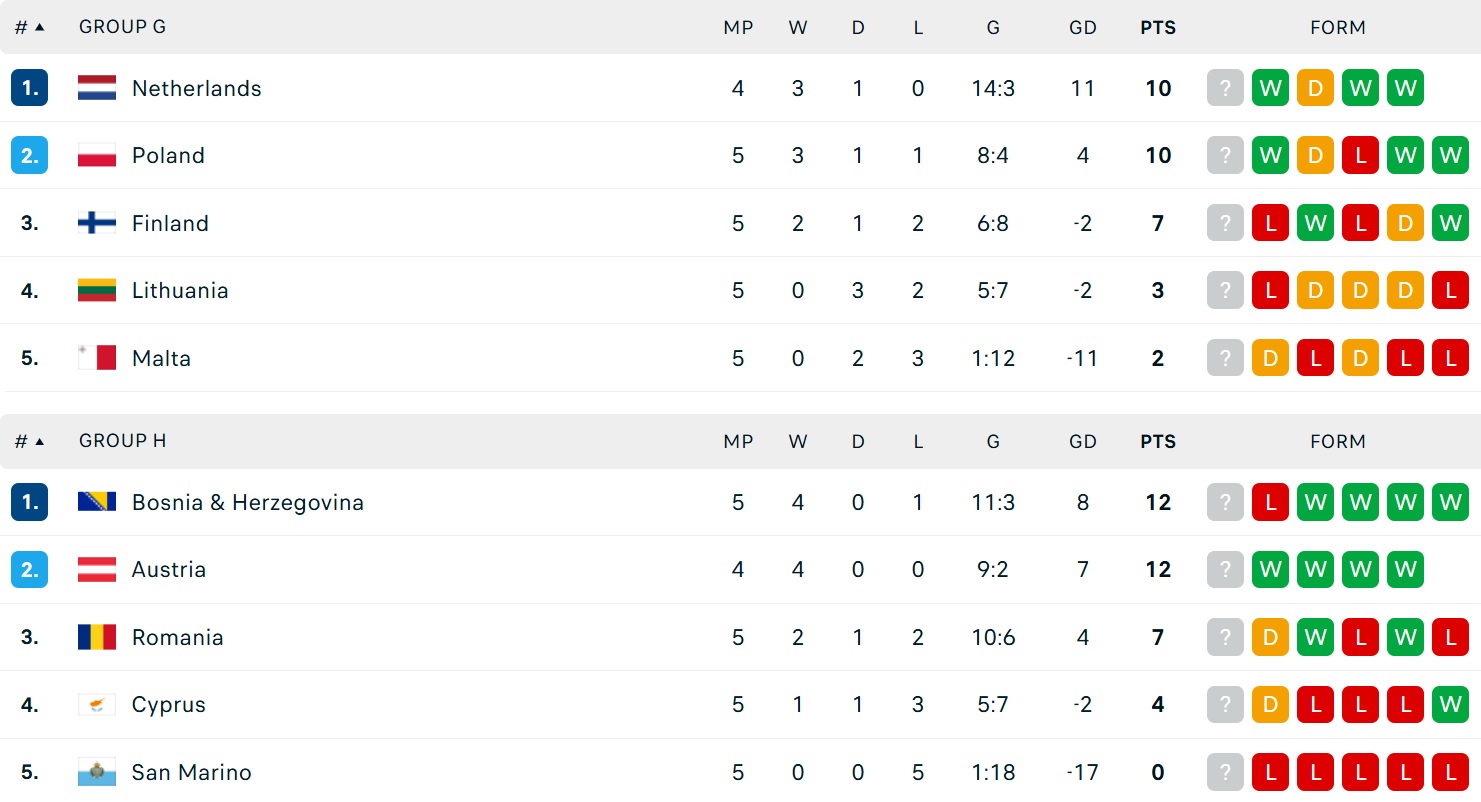 Kết quả bóng đá vòng loại World Cup 2026 hôm nay thuộc khu vực châu Âu. Kết quả các trận đấu của Tây Ban Nha, Đức, Hà Lan, Italia, Pháp, Anh...