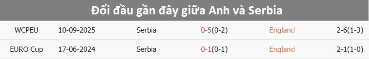 Tỷ lệ trận đấu: Anh toàn thắng 3 trận vừa qua cũng như cả hai cuộc đối đầu Serbia trước đó theo tỷ số châu Á. Phía bên kia, Serbia trải qua 6 trận thua liên tiếp.