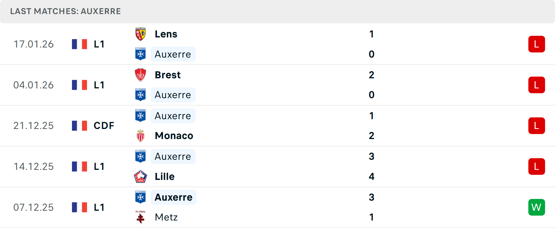 Auxerre đang rơi vào tình cảnh báo động khi đứng vị trí thứ 17 với chuỗi 3 trận thua liên tiếp tại giải quốc nội. Dù Auxerre đã kiếm được 10/12 điểm mùa này trên sân nhà, nhưng kỷ luật lại là vấn đề lớn với 5 thẻ đỏ tại đây.