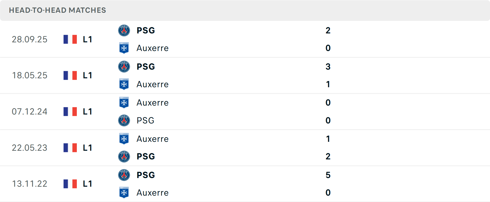 Tổng bàn thắng cả trận: 5/7 cuộc đối đầu trước đó giữa hai đội không vượt mốc tổng bàn thắng, tương tự là 2 trận mới nhất của Auxerre và 6/7 trận của PSG.