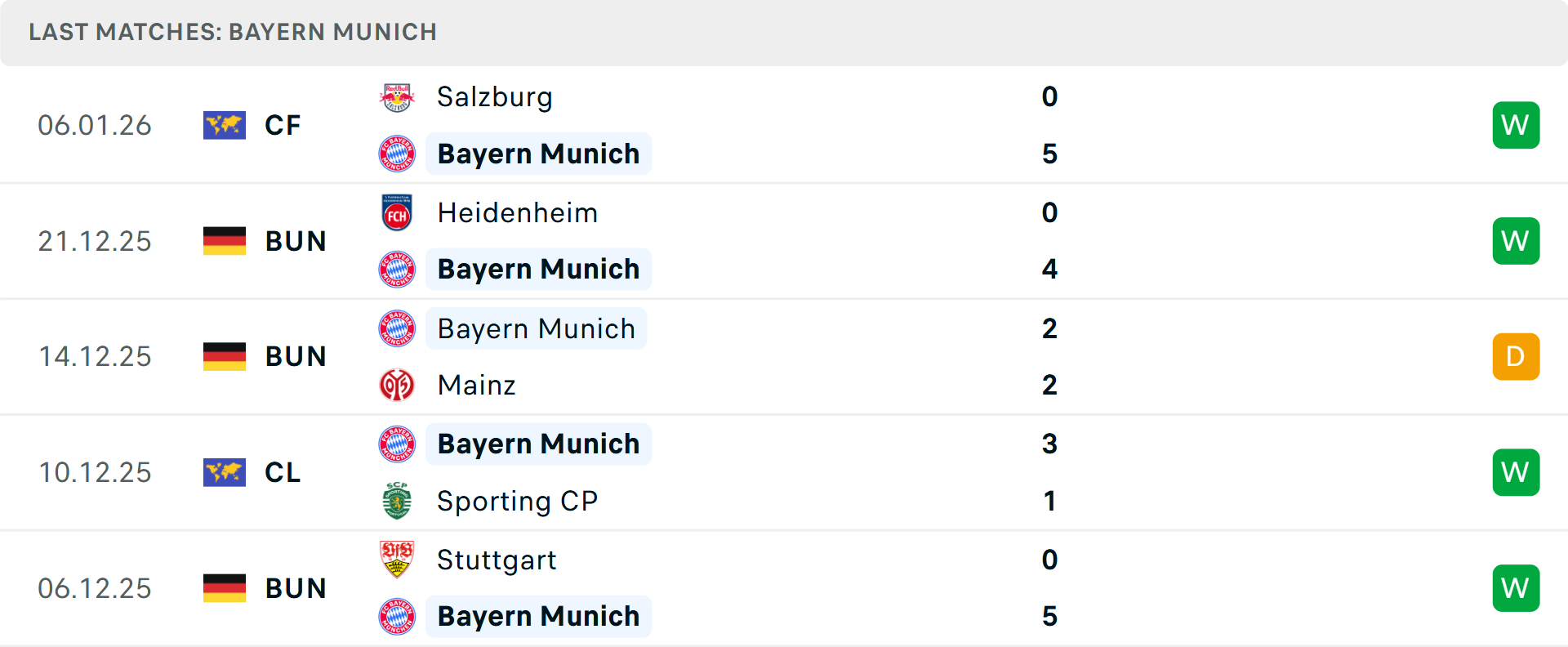 Bayern Munich đang thể hiện sức mạnh đáng sợ dưới thời Vincent Kompany với chuỗi 6 trận bất bại (thắng 5) và hiệu suất ghi bàn đáng nể: 19 lần nã đại bác vào lưới đối thủ chỉ trong 6 trận gần đây.