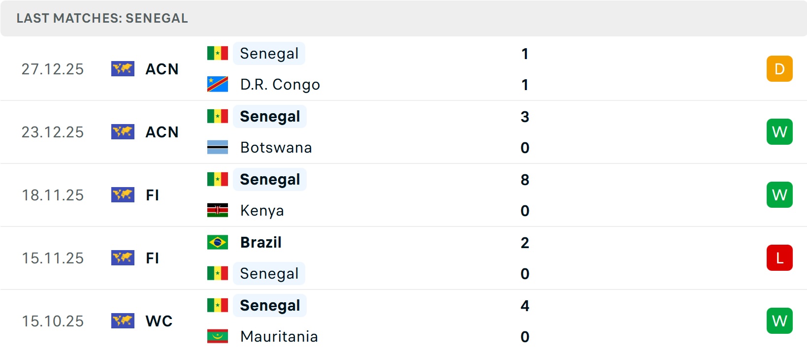 Phía bên kia chiến tuyến, Senegal dưới sự dẫn dắt của HLV Pape Thiaw đang thể hiện sức mạnh của ứng viên vô địch với 4 điểm sau 2 trận. Sự ổn định từ hàng thủ (Koulibaly, Mendy) đến hàng công với Sadio Mane và Nicolas Jackson giúp "Sư tử Teranga" chỉ thua 1/8 trận gần nhất (trước Brazil).