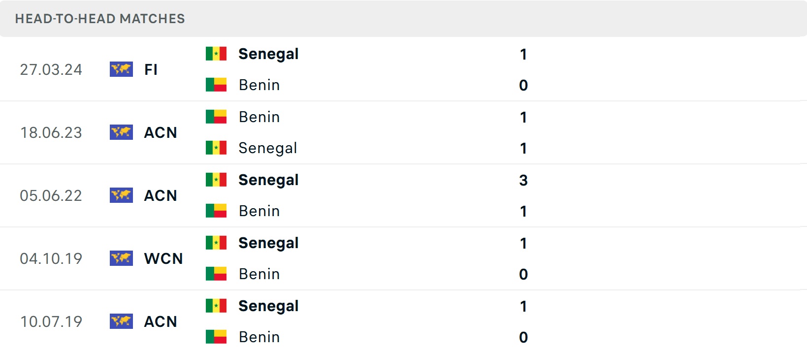 Tỷ lệ trận đấu: Benin thắng 5 và thua 3 trong 8 trận gần đây theo tỷ số châu Á. Về phần mình, Senegal thua 2/3 trận vừa qua.