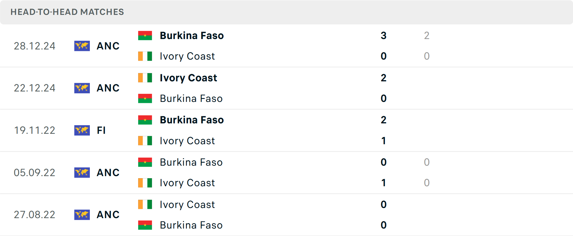 Tổng bàn thắng cả trận: 7/10 trận gần đây của Bờ Biển Ngà khôn vượt mốc tổng bàn thắng, tương tự là 2 trận mới nhất của Burkina Faso.