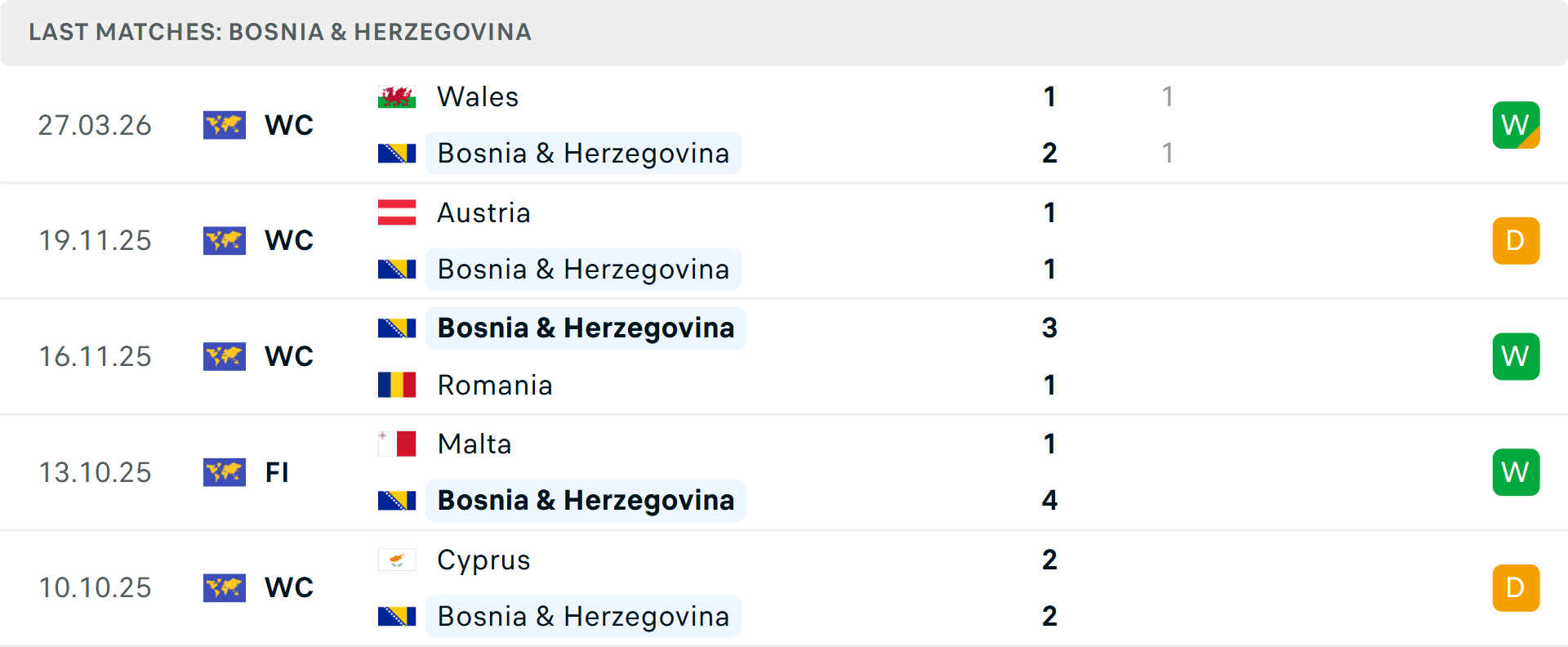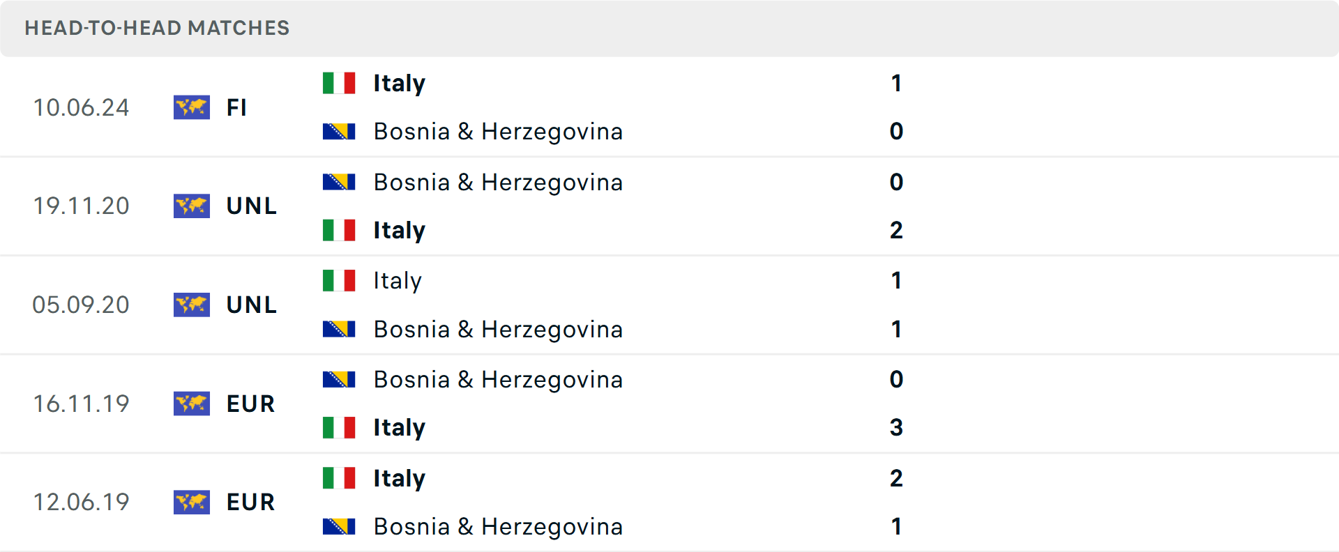 Tỷ lệ trận đấu: Bosnia toàn thắng 4 trận gần đây theo tỷ số châu Á. Phía bên kia, Italia thắng 2 và thua 2 trong 4 trận mới nhất.