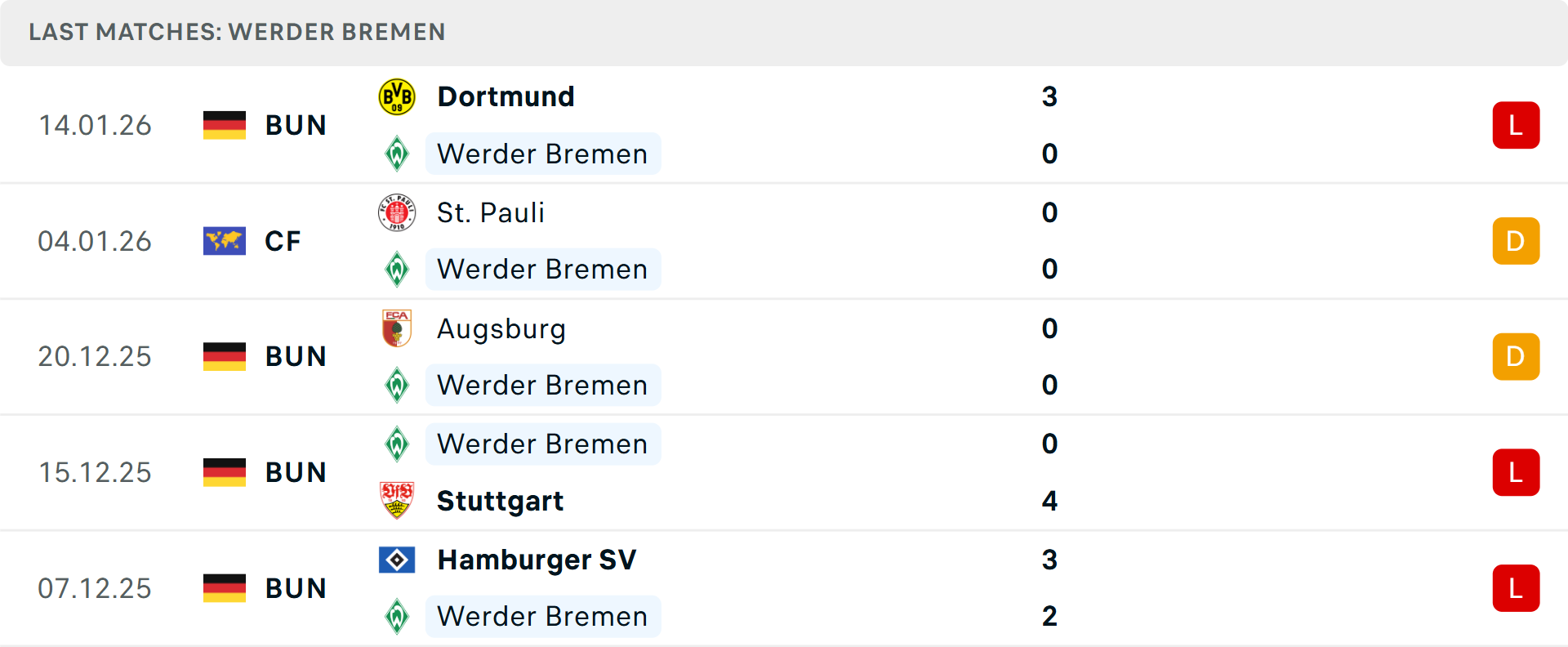 Bremen đang trải qua giai đoạn khủng hoảng với chuỗi 6 trận không thắng. Hàng công của "Các nhạc công" im hơi lặng tiếng trong 3 trận gần nhất, trong khi hàng thủ liên tục thủng lưới ít nhất 3 bàn ở 3/4 vòng đấu vừa qua. Sự thiếu vắng các trụ cột như Weiser hay Stage (treo giò) càng khiến đội bóng của HLV Horst Steffen gặp khó.